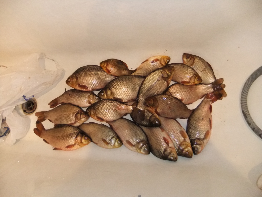 Одна удочка, 2-а часа, 19 красавцев карасей 7,6 кг весом... минус два пододка 0,14, 5-ть сходов и всего 6-ть отпущенных недомерков...