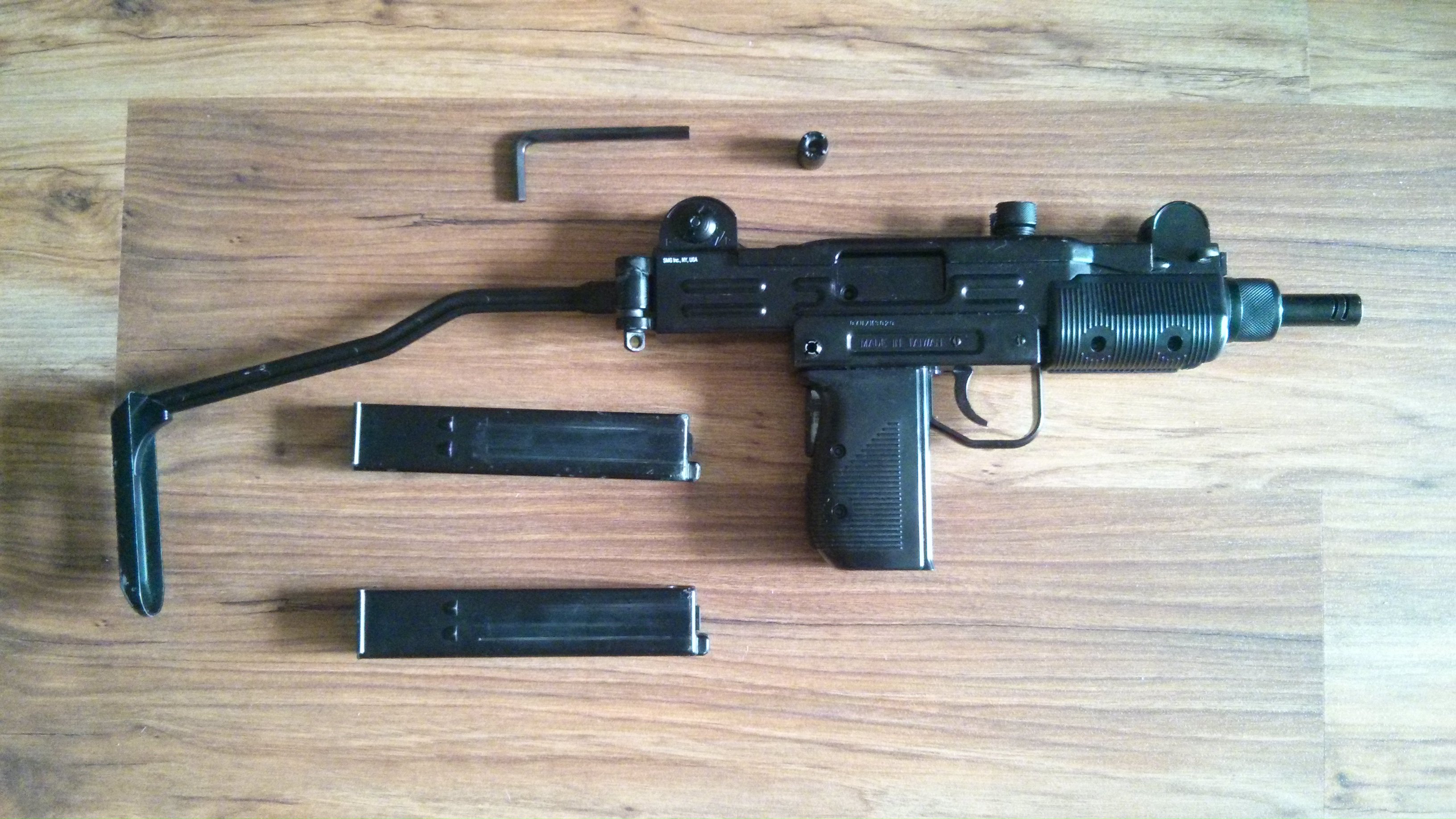 В комплекте UZM, два магазина (один новый, один немного травит в клапан), приспасоба для регулировки мушки, ключик.