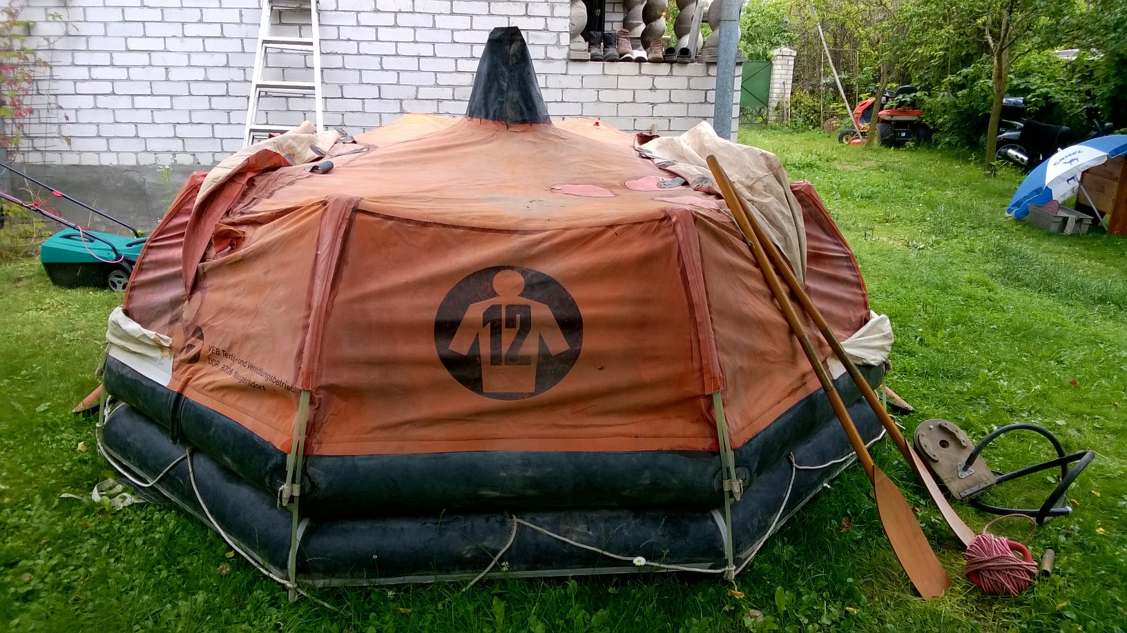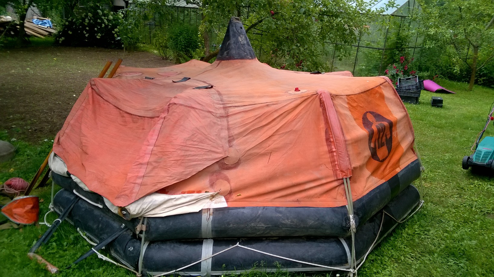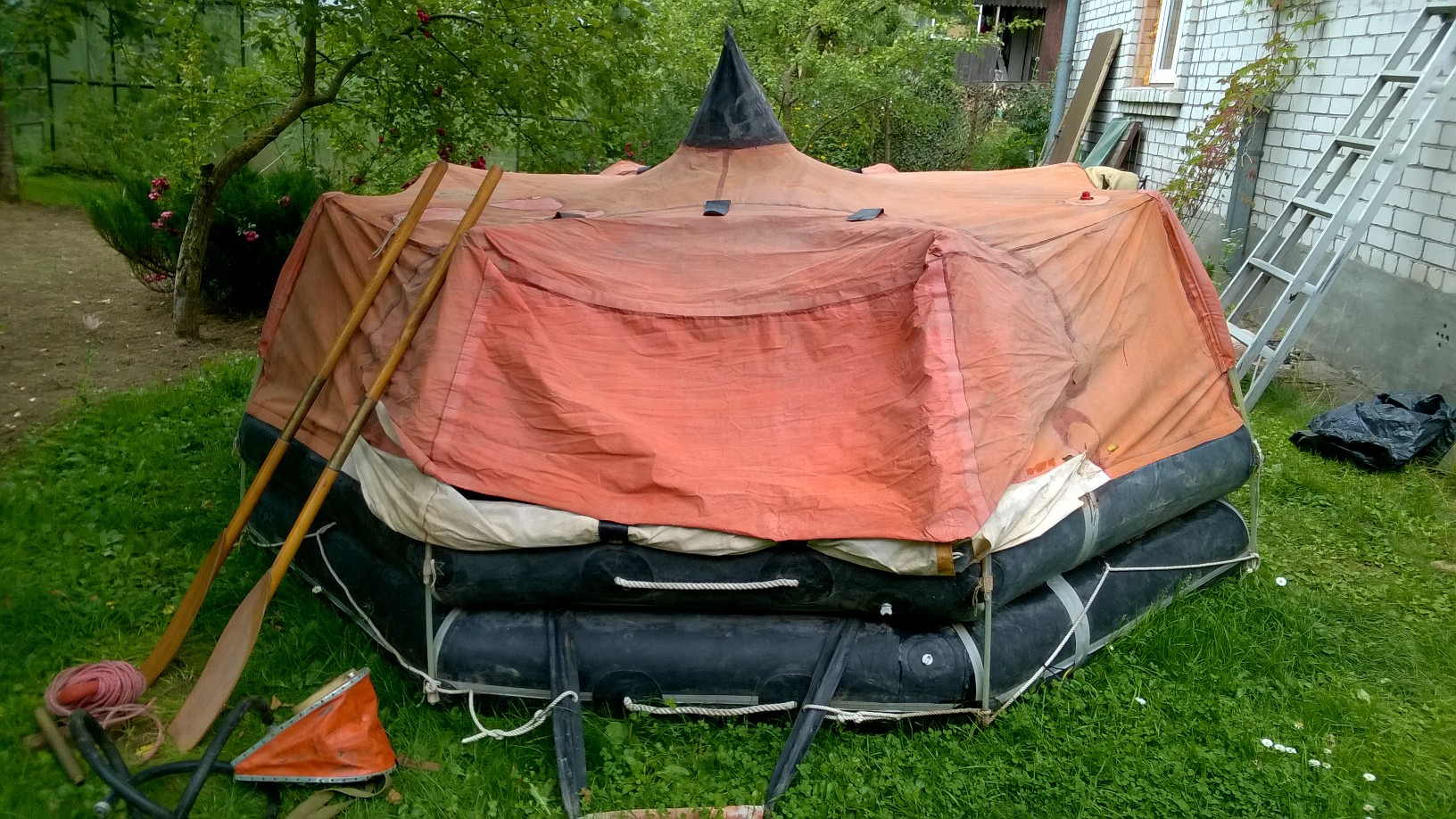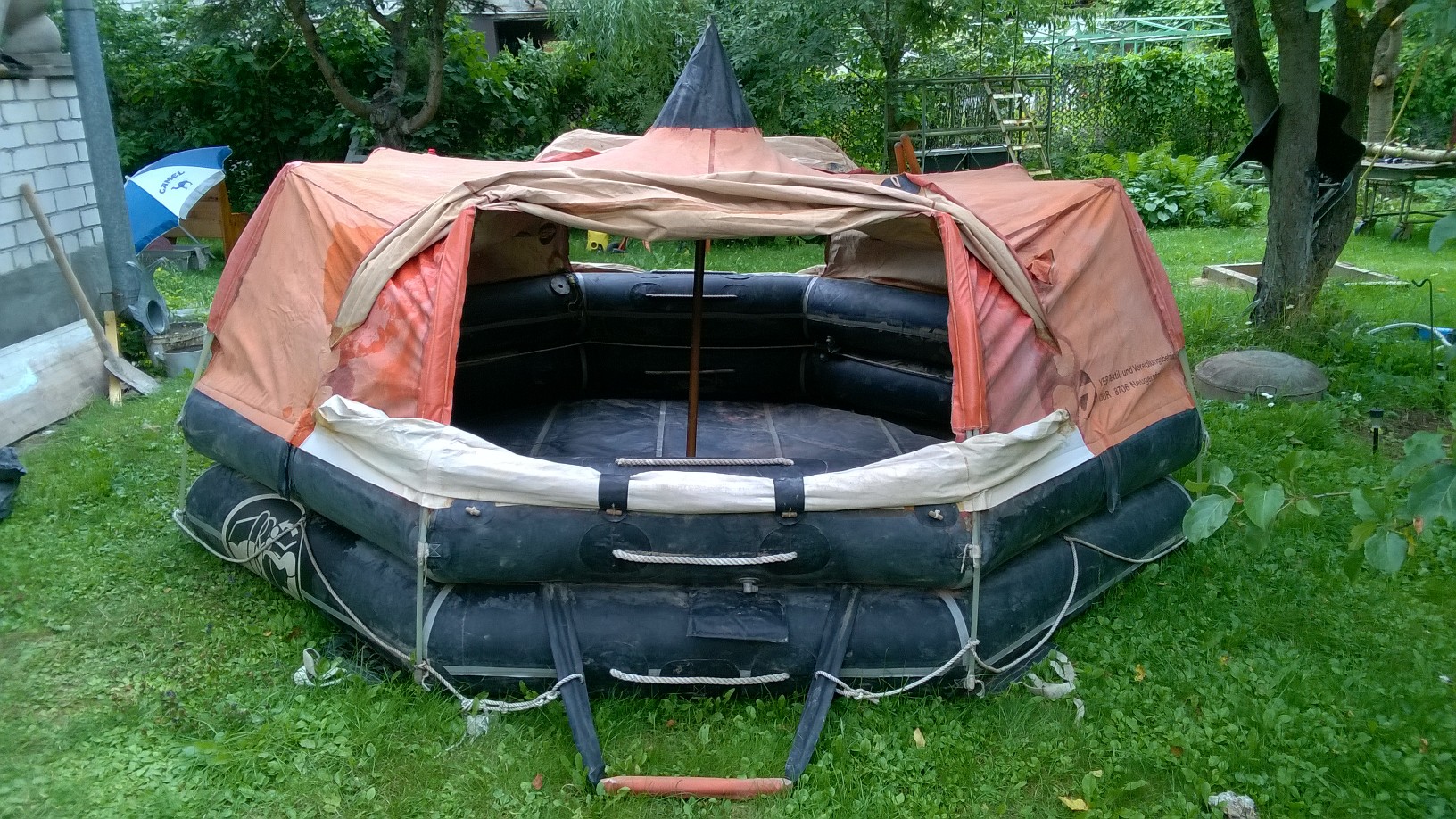 Плот в хорошем состоянии. 2 входа (задраиваются герметично) 4 уровня непатопляймости. Надувное дно. Освещение. Сидя помещает 12 человек. 4 человека спит как дома на кровати (причем на воде без проблем). Летом можно использовать как бассейн.
