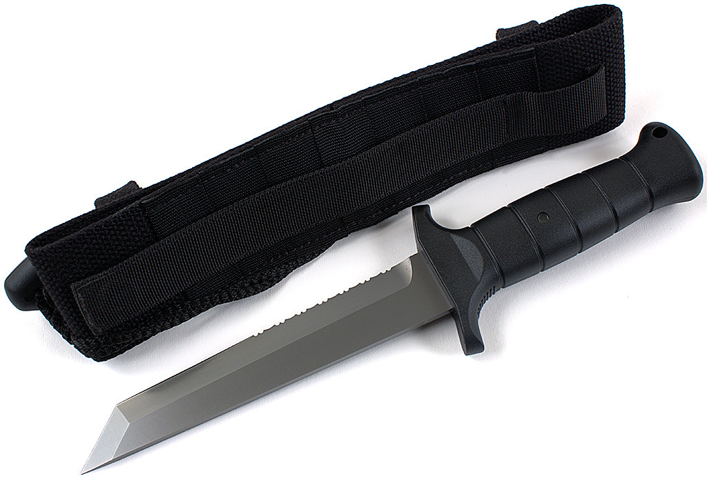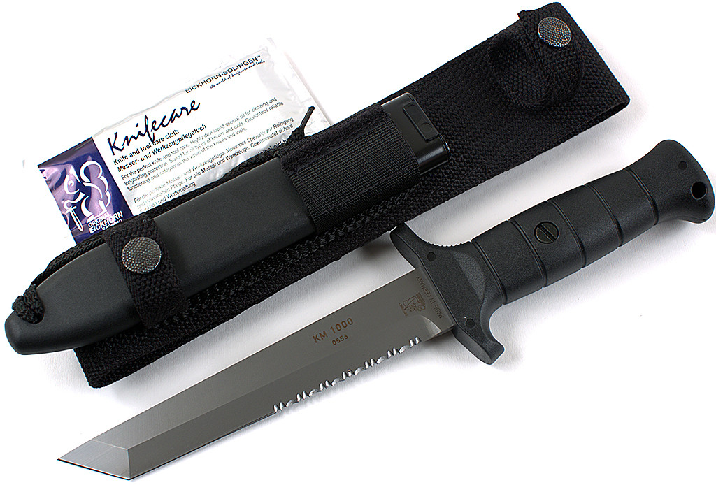 Боевой нож КМ 1000 с клинком Танто и с частичной волнообразной заточкой. Рукоять эргономичной формы их пластика, усиленного стекловолокном, снабжена ограничителем с упором для большого пальца и отверстием для темляка. Выступающая часть рукояти может использоваться как для обороны так и для разбивания стекол или забивания гвоздей. Специально разработанные ножны из комбинации пластика и нейлона подходят для всех систем крепления MOLLE/IDZ и могут поворачиваться на 180°. С обратной стороны ножен расположена алмазная пластина для заточки.