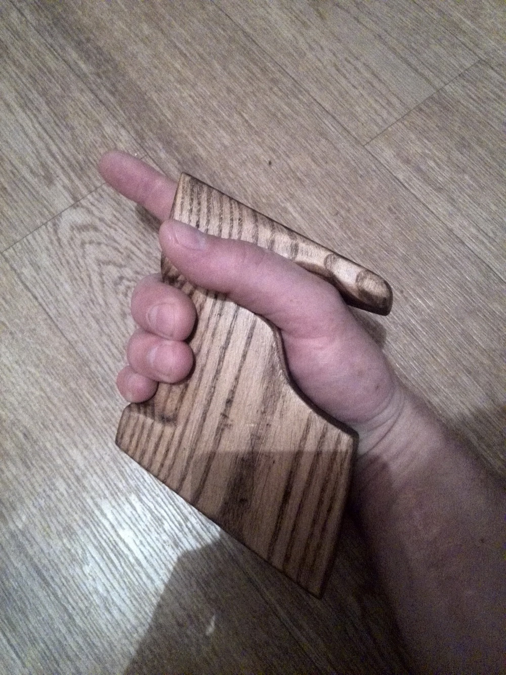 Вот держу свою рукоятку, большой палец не просится вверх, повыше к стволу, может у меня палец этот кривой)) , а может из за наклона самой рукоятки. Да, конечно для сравнения нужно подержать спортивный пистик и понять все отличия, но пока что не имею такой возможности. :ne_vi_del: