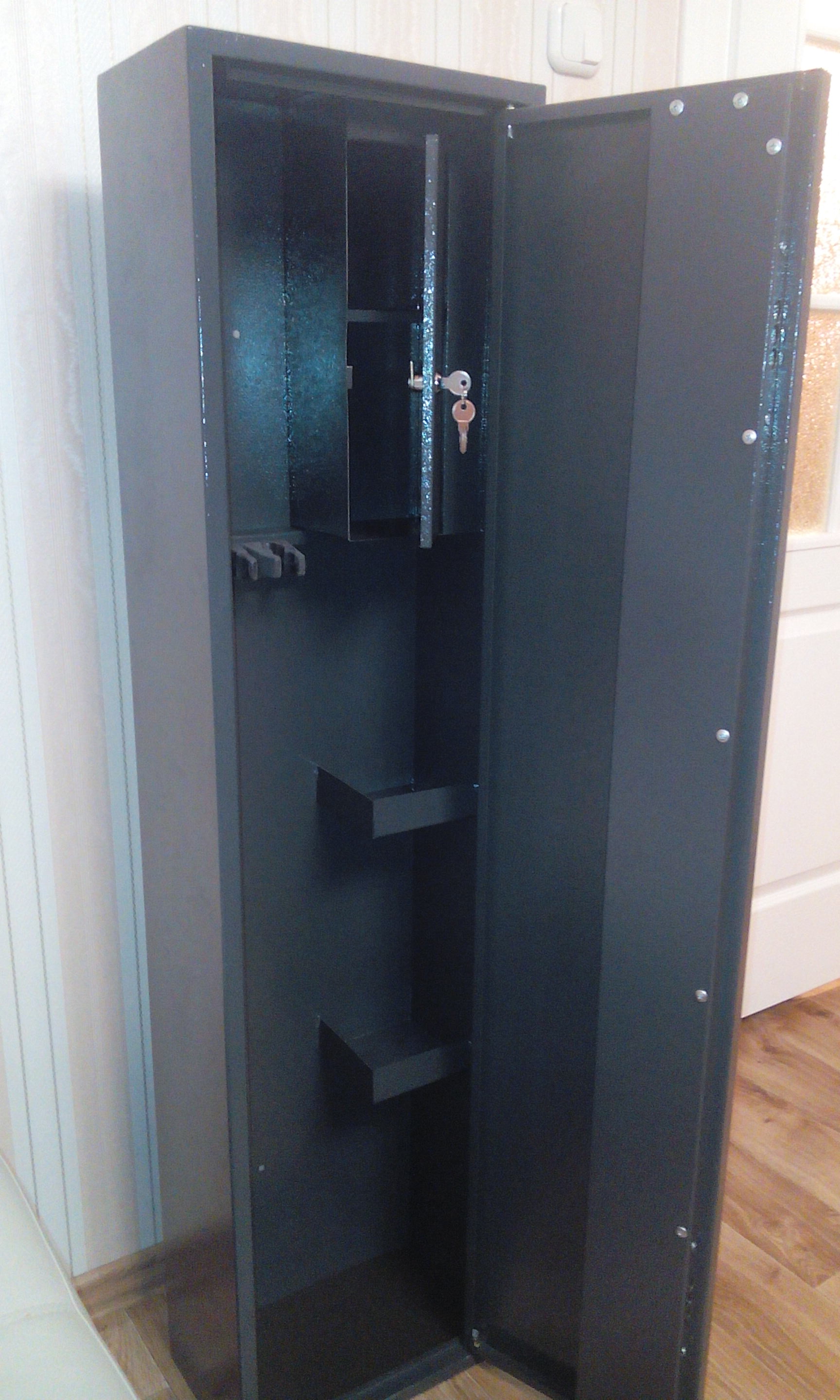 ! Сейфик благополучно был доставлен на логойщину. В связи с совершенно неожиданной победой в конкурсе, я еще совсем не определился с почетным местом, которое он займет в интерьере квартиры. Хочу сказать что приз очень кстати, так как весной планируется покупка карабина, а мой одноместный сейф занят гладкостволом. Сейф совершенно реальный и достаточно добротный; хоть и компактный, но без труда вмещает три единицы охотничьего оружия. Но больше всех конечно сейф понравился моему малышу - весь вечер и следующий день не оттянуть от него.
