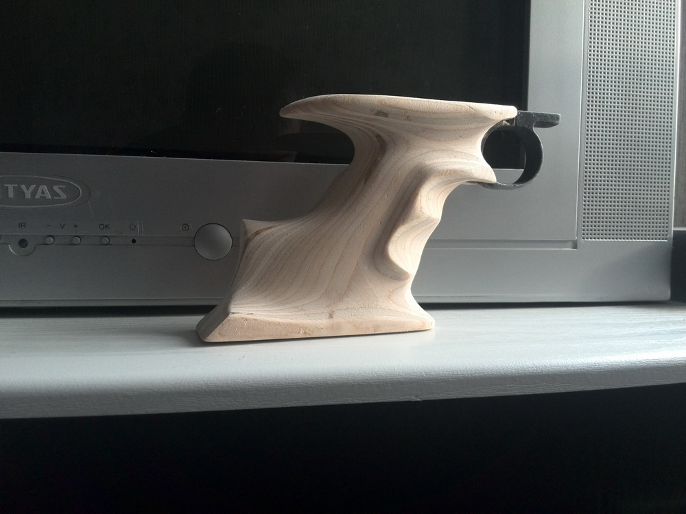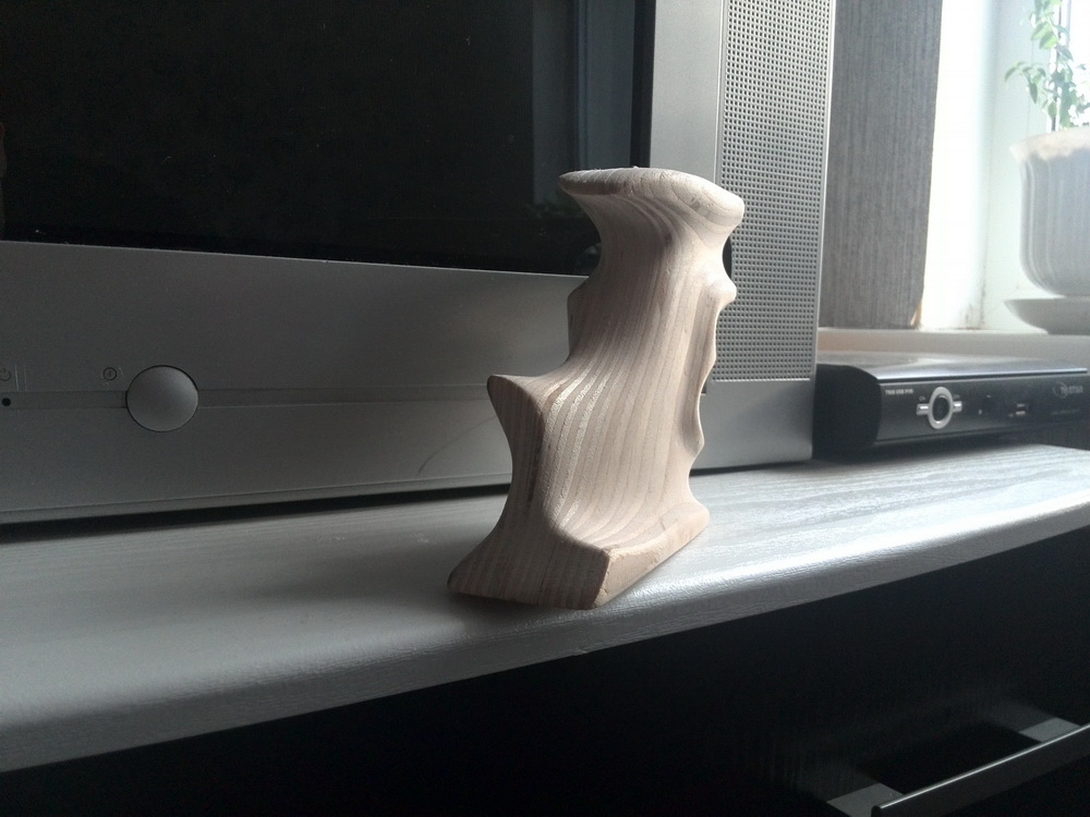 Cсылка скрыта. Для просмотра зарегистрируйтесь на форуме или войдите на форум.А мне очень понравилось и в фанерном исполнении.Довольно интересные плавные угловатости с переходом под ладонь.Действительно понравилось!Саня,а попробуй ради интереса отшлифовать её основательно и пропитать.Очень интересно-что выйдет из фанерной в сравнении с деревяшкой.А так скажу-хорошая рукоятка!!!
