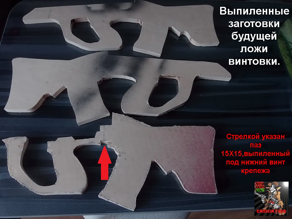 Доставил хлопот патронный магазин-выборка этих ячеек заняла продолжительное время,ладно хоть сучок один попался,и то «детский».Но шпаклевать всё же пришлось-после высыхания обработку продолжил.Вообще шпаклевать пришлось много,не из-за того что фанерка была плохой(она плохой и не была),просто хотелось сделать более плавными переходы и т.д: