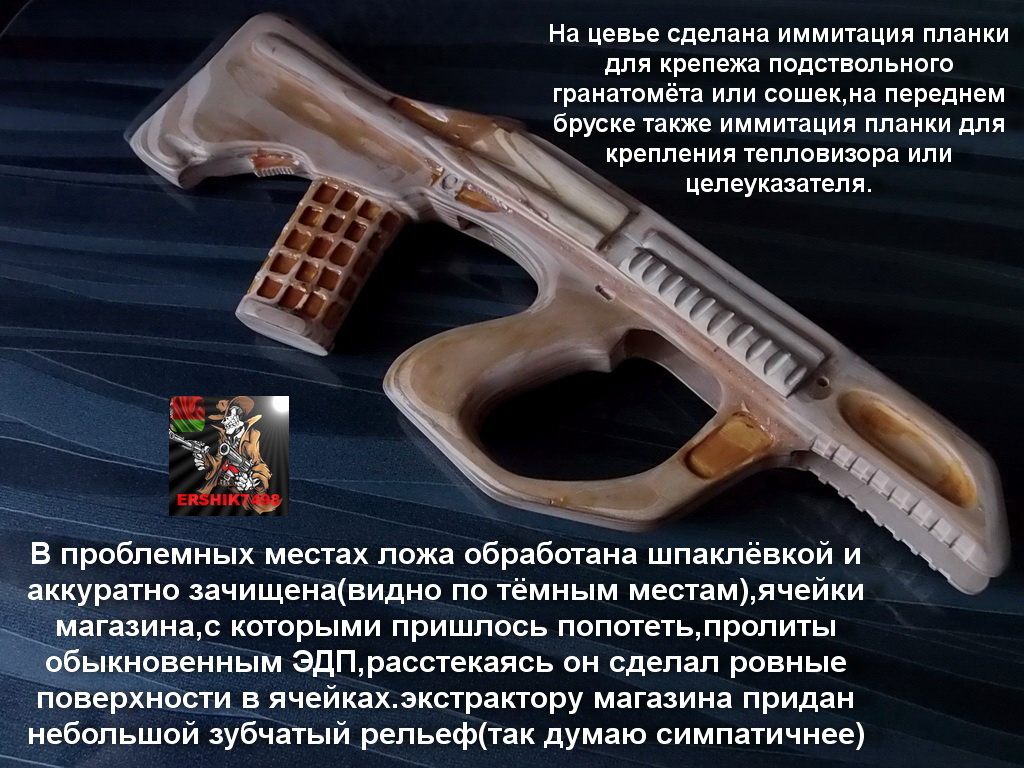 Достал и принялся-в подготовленные места вклеил на ЭДП педальки от зажигалок.Это для имитирования переключателей штор экстрактора гильз и кнопок переводчика огня.Доработал на цевье что-то похожее на планку для крепления гранатомёта,сделал из ясеня рукоятку затвора.Свил из оцинкованной стальной проволоки пружинку для затвора,вклеил на ЭДП в подготовленную канавку.Следом доработал форму затворной рамки и на шпильку вклеил в затвор изготовленную ранее ручку.На правой стороне на приклеенном переднем бруске изготовил имитацию планки для крепления целеуказателя.В выборке также где-то углублялся,где-то шпаклевал лишнее,пересверлил отверстия.Доработал рельеф на ложе с наружной стороны.Примерно всё что перечислил,делал уже вне дома и фотографировать было нечем,что успел: