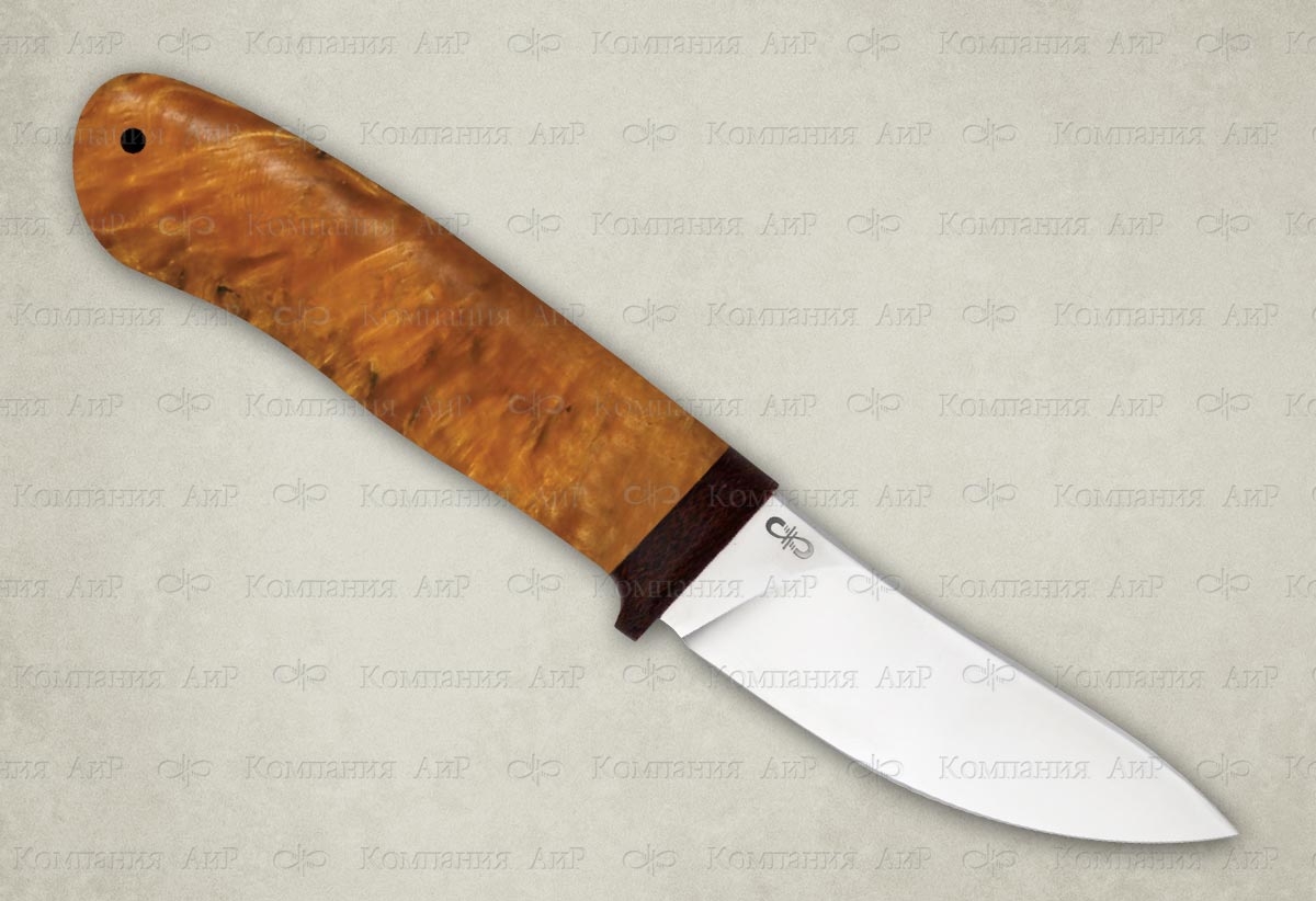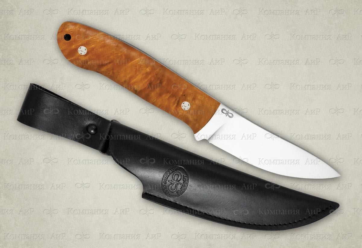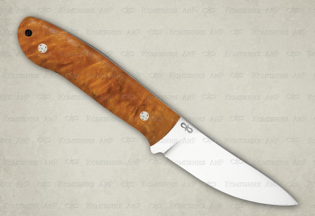 Новинка 2015 года. Красивый и удобный малый разделочный нож с клинком, имеющим прямые спуски от обуха, образующие тонкое, прекрасно режущее лезвие. Демонстрирует отличные режущие качества. Форма клинка, типичная для скинера, позволяет снимать шкуру разделываемого животного, без риска при этом повредить брюшину. Клинок имеет длину 89 мм и толщину обуха 3,4 мм. Рукоять удобно ложится практически в любую ладонь. Монтаж клинка всадной, не разборный. Отличный выбор для разделочных работ на охоте и на ферме.