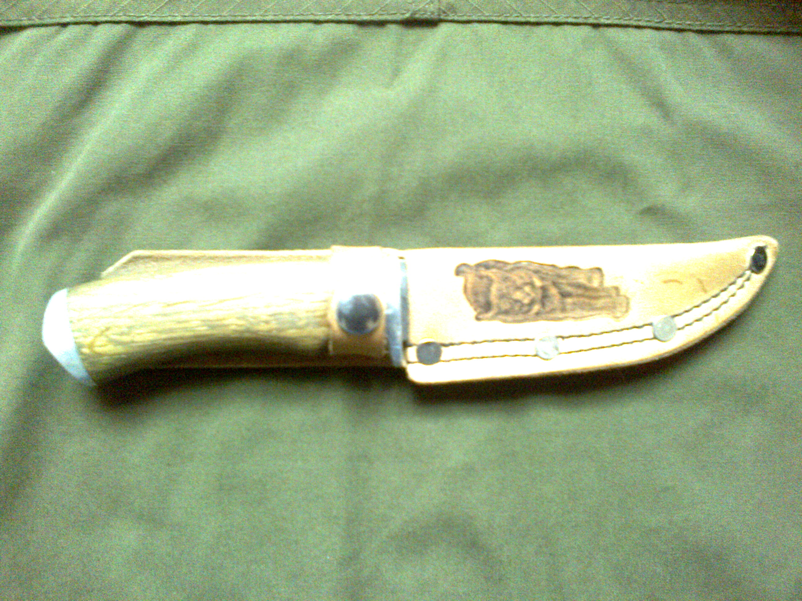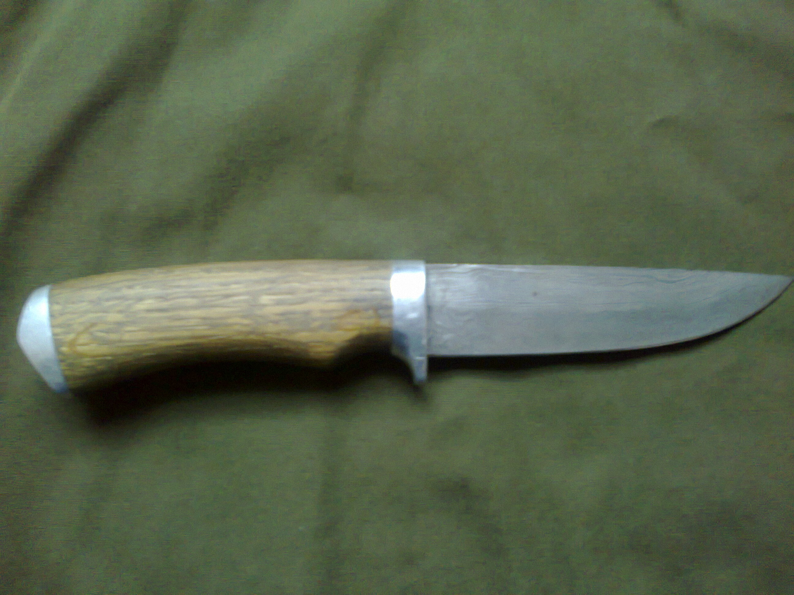 Нож охотничий самодельный (купил)б/у, длина 23 см, длина клинка 11,5 см, толщина обуха 4 мм, сведение тройной клин, сталь кованая под дамаск, твердость не знаю (судя по тому как точится не менее 58), деревянная рукоять, больстер - алюминий, кожаный чехол - 600 000 рублей.