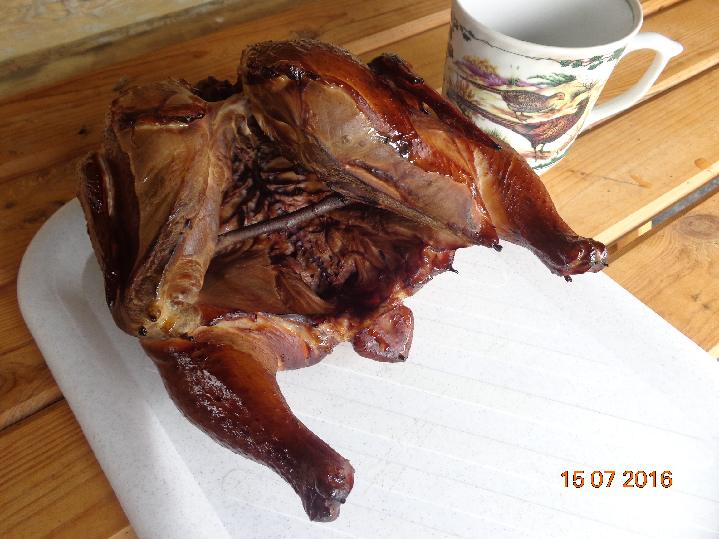потом сняли поджарку,думали готова,отрезали кусочек,сыровата внутри,хотя готовилась,с утра и до вечера...,всё-таки таким способом коптили впервые...
