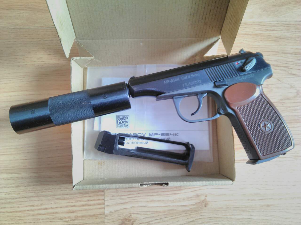 tov.starshina писал(а):Пистолет в очень хорошем состоянии,не без потёртостей конечно,настрел небольшой,газом не ссыт,обслужен и смазан.В комплекте второй,абсолютно новый,не видавший в себе баллончика,магазин.Имеется коробка и паспорт изделия МР-654К.