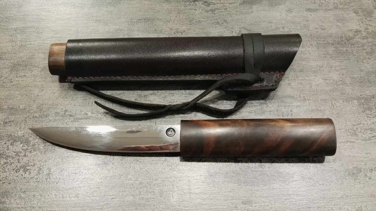 2.нож якут, сталь У10, клинок 125х26х4,0, рукоятка свилеватый темный орех, пропитка тунговое масло, ножны кожа пола, вощеная нить, финиш карнаубский воск