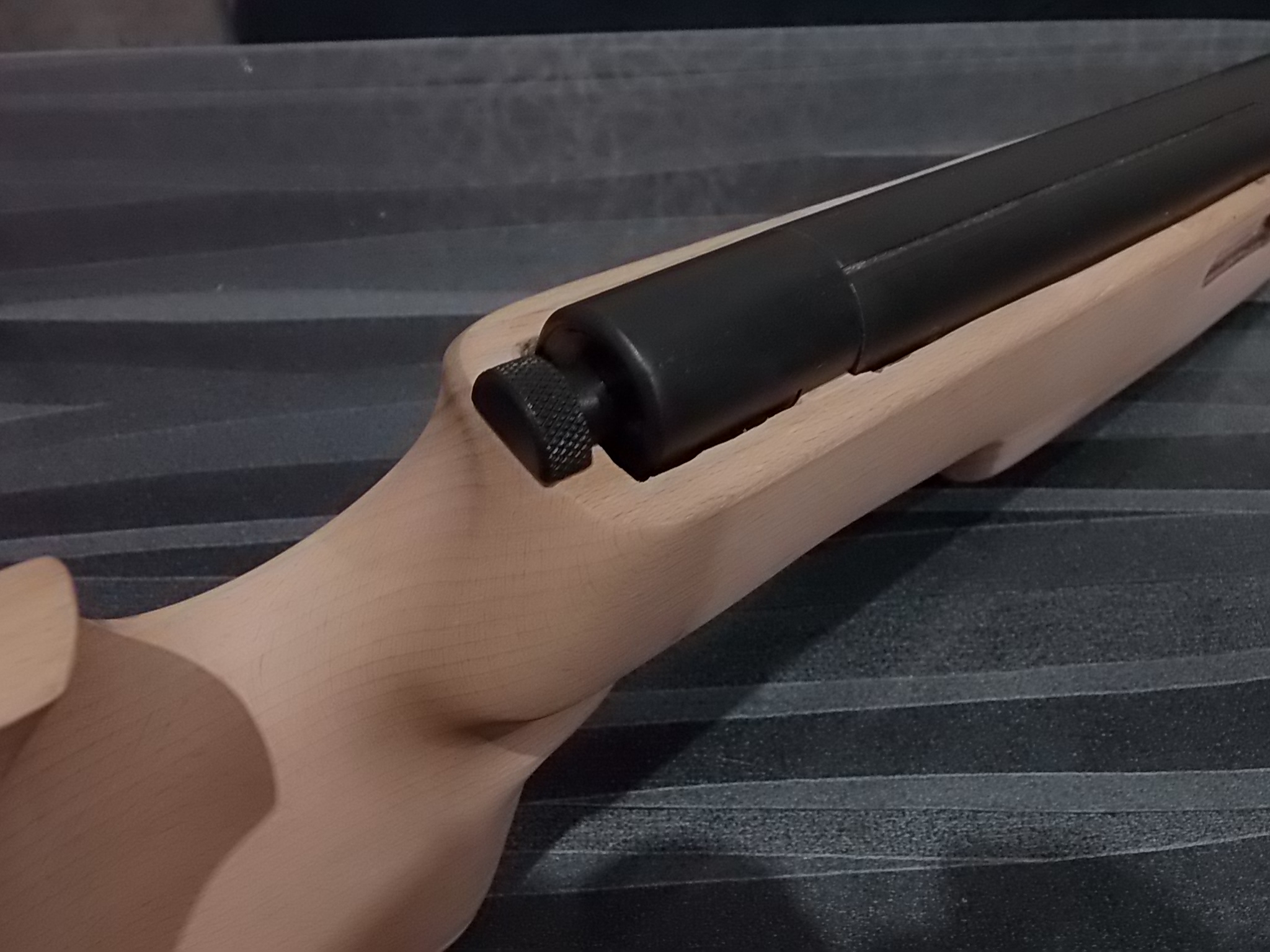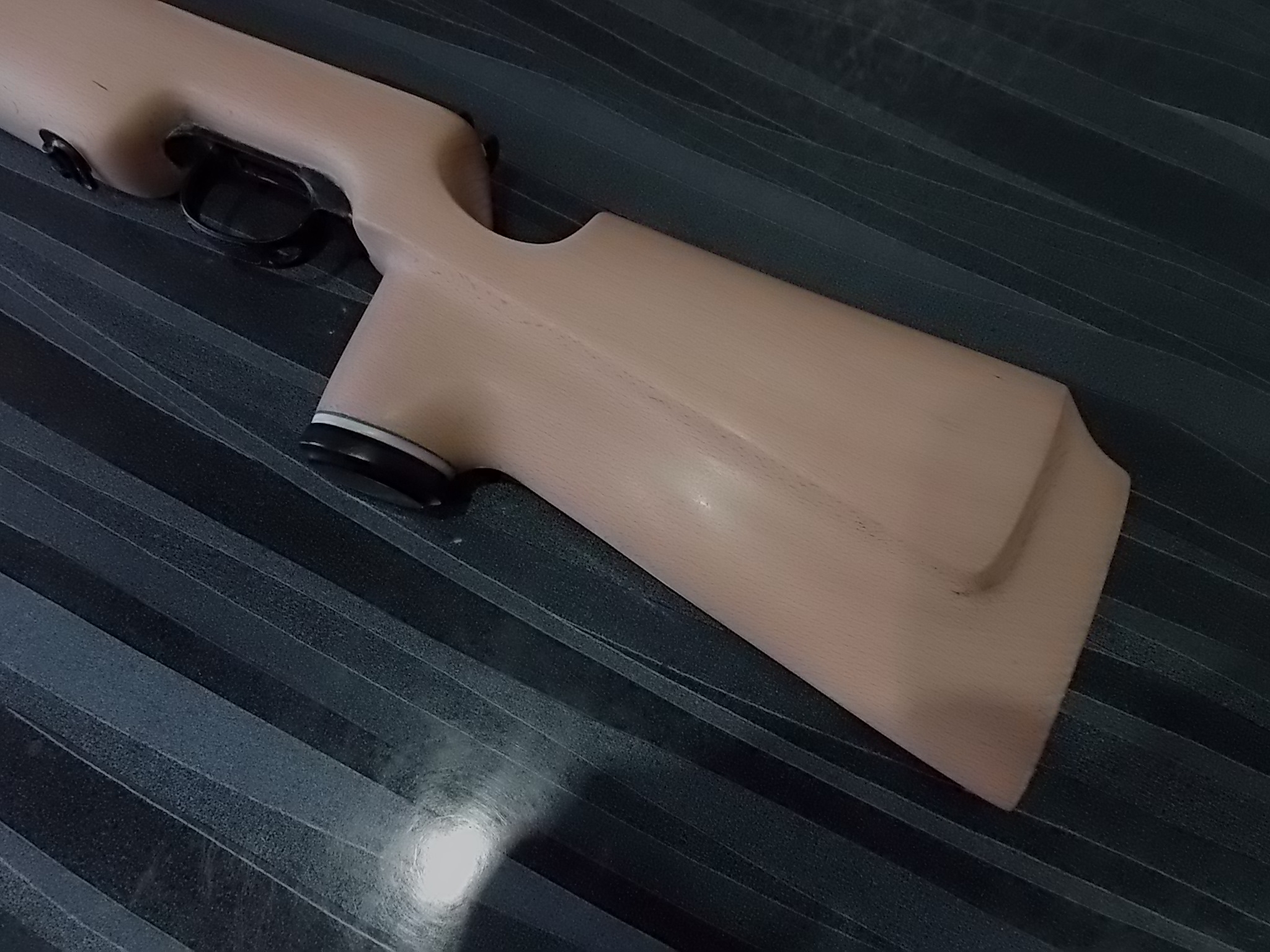 Примерившись «железом» понял-высоту нужно немножко уменьшить,буквально 10мм необходимо было удалить с верхней плоскости ложи.Спусковой крючок недостаточно хорошо торчал снизу.Соответственно и щека приклада тоже была доработана ниже.Немножко под большой палец подогнал шейку приклада-очень мне удобно именно так удерживать винтовку-охватить 3 пальцами рукоять,а большой просто упереть в шейку за компрессором.