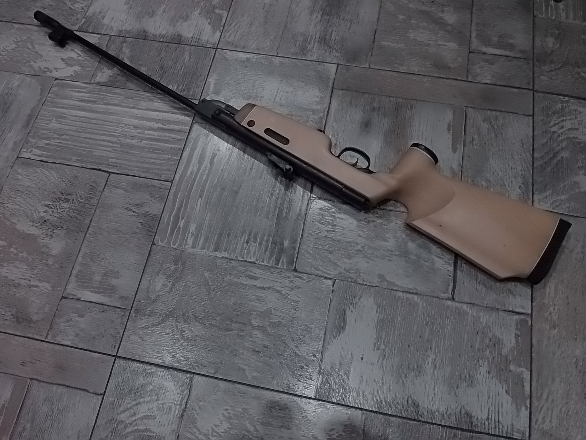 Итак… «Железо» было практически уже доведено до нужного уровня.Полную сборку железяк отложил-ведь нужно делать было ложу для винтовки,а примерять железяку в ложу, постоянно хватаясь пыльными руками за неё не хотелось.Потому компрессор оставил именно пустым под примерку.Ну а ложу применил имеющуюся в заначке. Купил на барахолке ложу от «Кубика» как-то.В целях было приладить в неё «Крысу». Но к сожалению не вышло-даже отпиленная до возможного крысоручка не позволила этого.Вот и лежала она дожидаясь «звёздного часа» своего.Воспользуюсь фото продавца-к сожалению сам забыл сделать.Ложа кстати не орех!!!Это бук,но весьма качественный и красивый!В любом случае шкурить её нужно было-на ложе было несколько глубоких выбоин и трещинка: