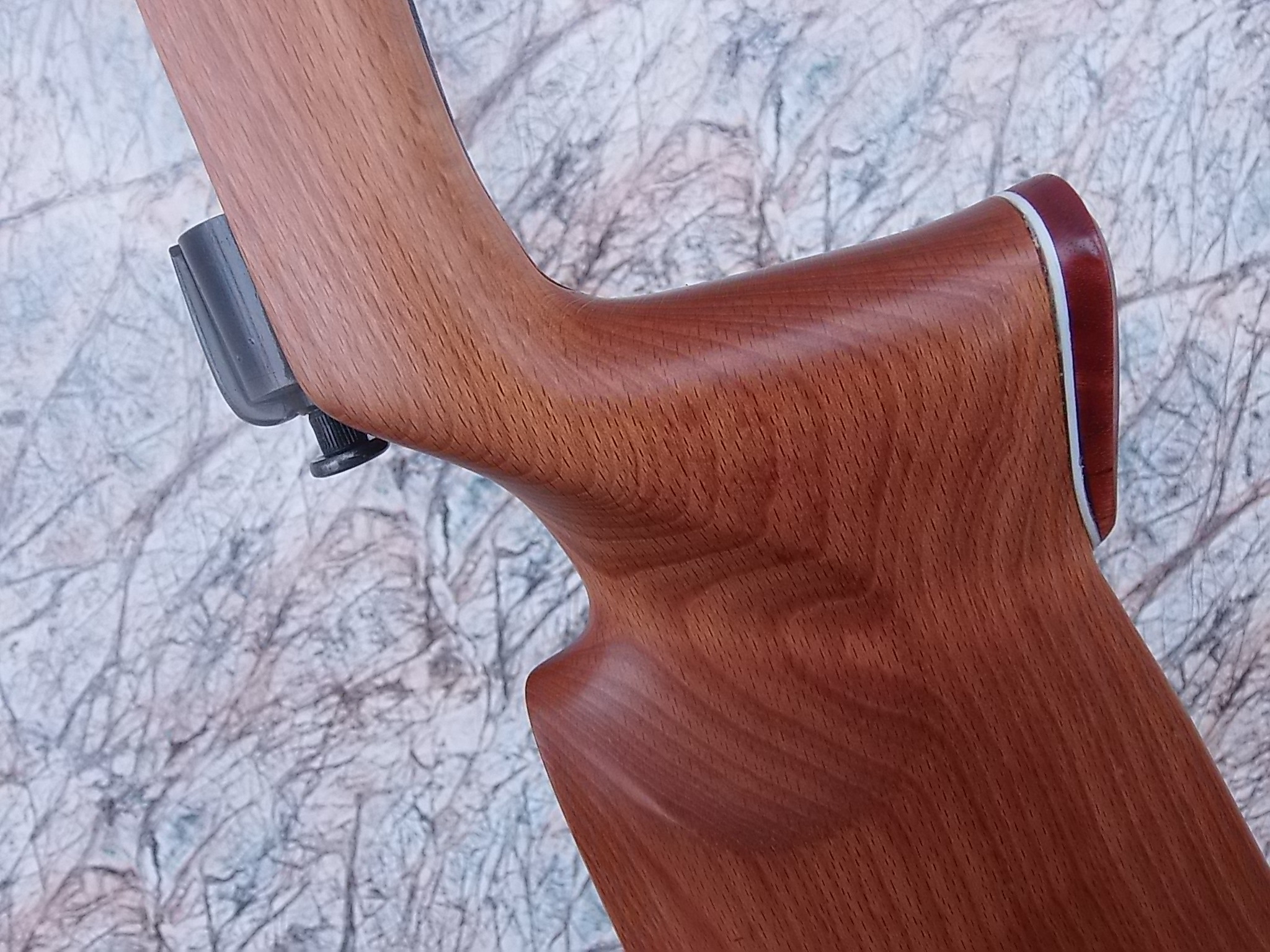 После чуть окультурил сам приклад.»Щека» на прикладе была во первых несколько высоковата для прицеливания,потому срезал лишнее.Во вторых-больно она острая была.Не знаю как другим,а мне эта деталька неприятно скулу на морде лица резала при прицеливании. Поэтому округлил её слева,а справа несколько выделил этот «нарост» полукруглой стамеской.Конечно обработал всё наждачкой.Вот что вышло: