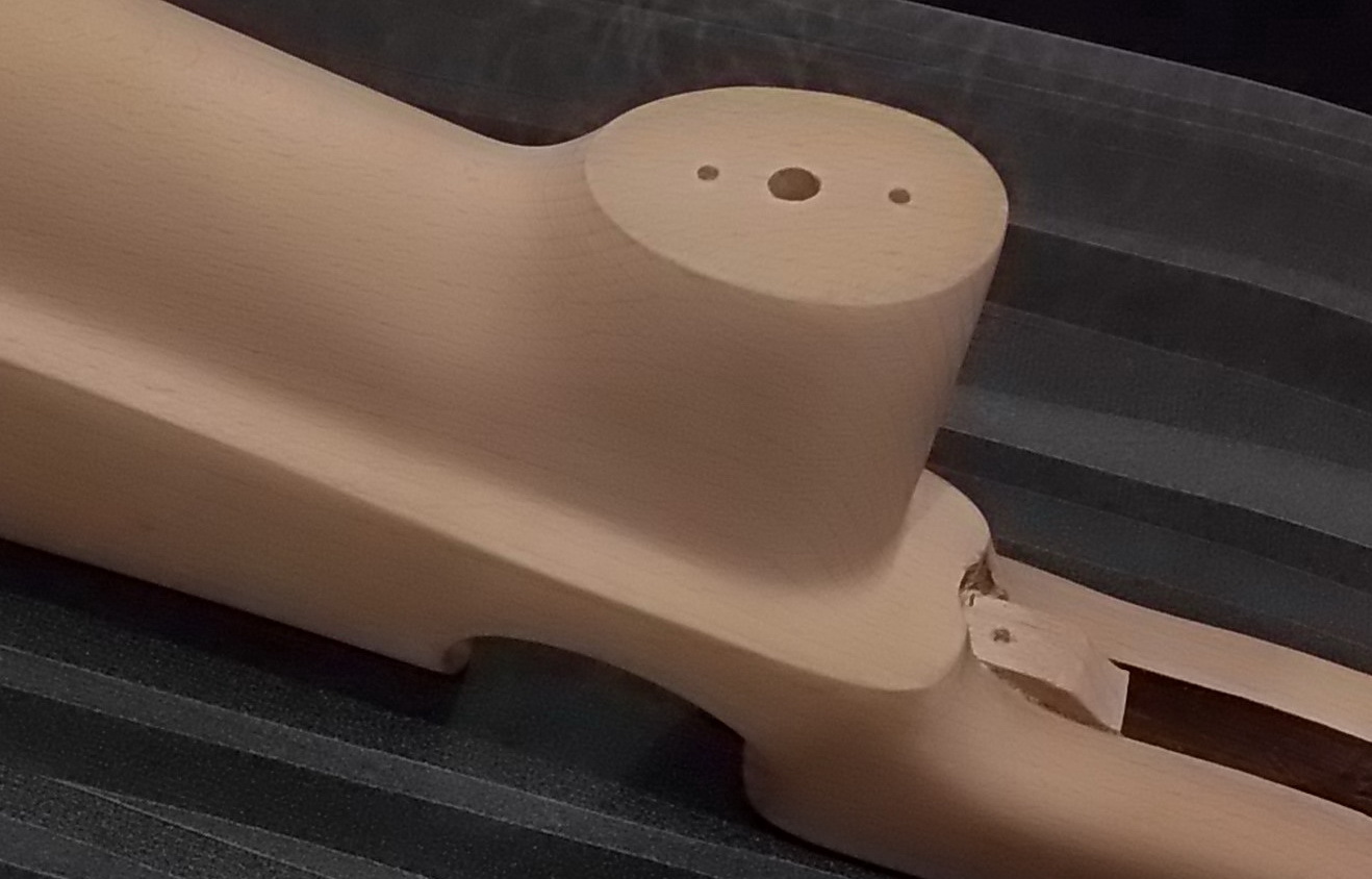 Ложа была не пропитана-она просто окрашена каким-то вишнёвым лаком или типа того.Просто лак-без морилок,масел и т.д.Отшкурить её удалось довольно быстро-бук отлично обрабатывается.Просто чтобы снять лак-я работал наждачкой на оправках сначала перпендикулярно волокнам,а затем теми же наждачками тёр вдоль волокон, убирая попутно царапинки.И вот что вышло после нескольких часов работы: