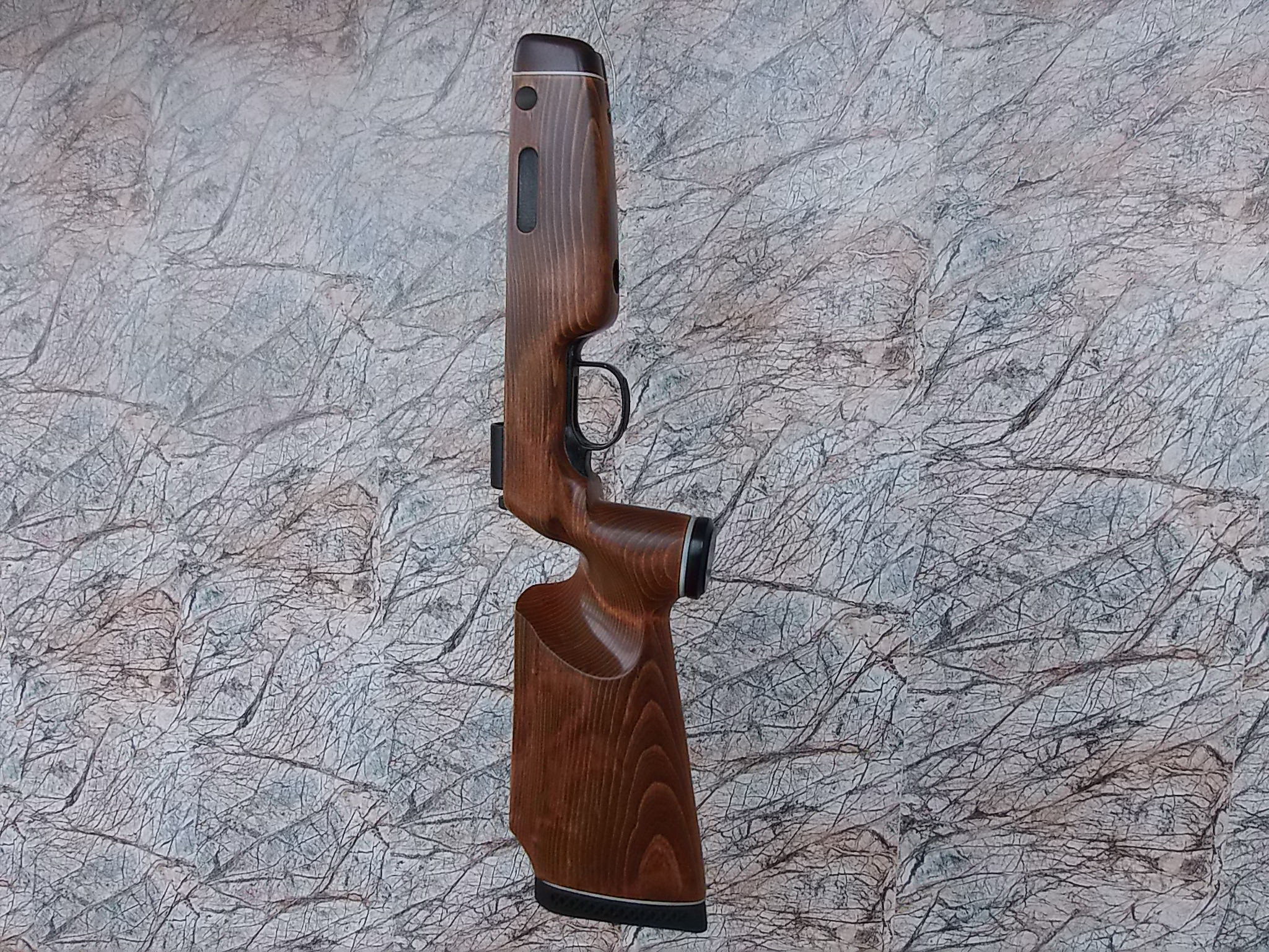 Итак… «Железо» было практически уже доведено до нужного уровня.Полную сборку железяк отложил-ведь нужно делать было ложу для винтовки,а примерять железяку в ложу, постоянно хватаясь пыльными руками за неё не хотелось.Потому компрессор оставил именно пустым под примерку.Ну а ложу применил имеющуюся в заначке. Купил на барахолке ложу от «Кубика» как-то.В целях было приладить в неё «Крысу». Но к сожалению не вышло-даже отпиленная до возможного крысоручка не позволила этого.Вот и лежала она дожидаясь «звёздного часа» своего.Воспользуюсь фото продавца-к сожалению сам забыл сделать.Ложа кстати не орех!!!Это бук,но весьма качественный и красивый!В любом случае шкурить её нужно было-на ложе было несколько глубоких выбоин и трещинка: