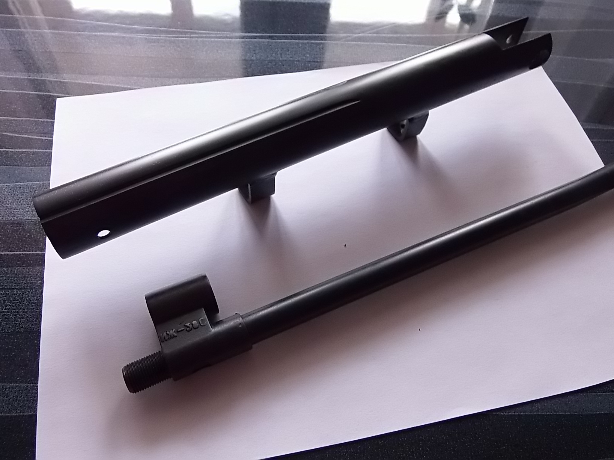Теперь необходимо было заворонить зачищенные компрессор и ствол.Также и надульник хотел стать воронёным.Изначально думалось заворонить баллистоловским «Клевером».Но глянув на остаток его в флакончике понял-не хватит.Принял решение попробовать заворонить в селитре. Поварить в общем «железо». Немного полистал советы по такому виду воронения, набравшись смелости не запороть работу-отправился к тётушке,проживающей в частном секторе.Племяшу,а тем более весьма любимому,была предоставлена подходящая посудина из нержавейки, дровишки, указано место где можно разжечь огонёк,отыскалась и какая-то рогаза типа подставки для варки на огне…Селитру принёс свою,5 пачек средства «Крот»,масло ружейное «Беркут» нейтральное.Ну и принялся заниматься.Компрессор ничем не затыкал,а ствол с обоих сторон законопатил деревянными чёпиками. Рассчитывалось, что в кипятке деревяшки ещё разбухнут и не дадут просочиться жидкости в стволик.Надульник изготовленный кинул в общий котёл…Соседи тёткины повылазили на улицу-очень им было интересно,что же там я варю?Вонь конечно стояла изысканная,но вполне терпимая. Хорошо что переоделся-шмотки все пропитались запахом окисленного металла, а во рту этот привкус стоял весь следующий день,никакие пасты и ополаскиватели не помогали.Нанюхался от души.Когда достал железки из котла-хорошенько промыл их в тёплой воде,из ствола достал деревяшки,хорошенько промыл водой железяки,вытер насухо,всё не жалея обрызгал ружейным маслом. Оставил на пару часов полежать.Затем вытер масло мягкой ХБшечкой,а ствол протёр мягким ёршиком и ватными палочками прогнал.Внутри ствол сиял просто!!!И результат этого «пикника» мне понравился!Воронение получилось весьма качественным-стойкое и красивое- с заметным иссиня-чёрным оттенком!На фото не передано истинной красоты его к сожалению,ну как есть: