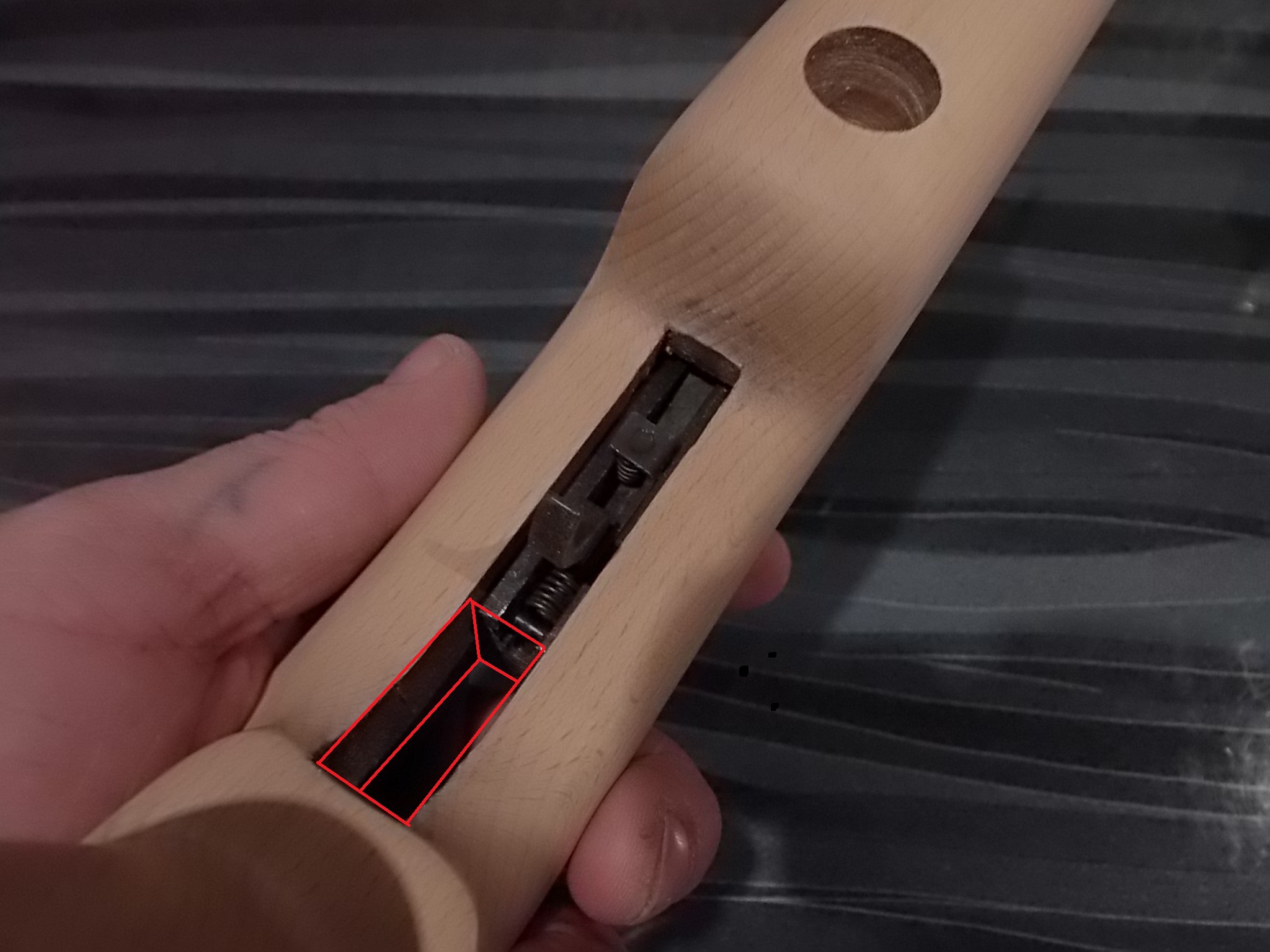 Решено было доработать рукоять прокладкой с чёпиком.Прокладку сделал из пластмассы,подогнал под рукоять,затем из груши сделал чёпик по ней.Думалось что оставлю именно так,но позже решил окрасить его в чёрный цвет матовый.В прокладке сделал два отверстия под саморезы мелкие и в середине отверстие диаметром 8мм для крепления чёпика. В самом чёпике с внутренней стороны сделал неглубокое отверстие,в это отверстие вклеил на ЭДП саморез шляпкой вниз.Основание рукояти намазал ЭДП,притянул прокладку на 2 самореза к ней.Хаотично насверленные отверстия в прокладке для лучшего схватывания ЭДП с ней и чёпиком.Выдавленный клей заполнил их наполовину.Остальное должно было заполниться клеем с чёпиком. Кроме этого в среднее 8мм отверстие также нужно было накапать ЭДП и вставить чёпик вклеенным саморезом в это отверстие,прижать.Застывший ЭДП надёжно удержит так чёпик в рукояти.Чёпик был вклеен позже после покраски его матовой чёрной краской,хотя по совести чуть-чуть потом пожалел об этом.Лучше пожалуй было бы оставить его так.Но что сделано-то сделано.Примерно то,что описал выше: