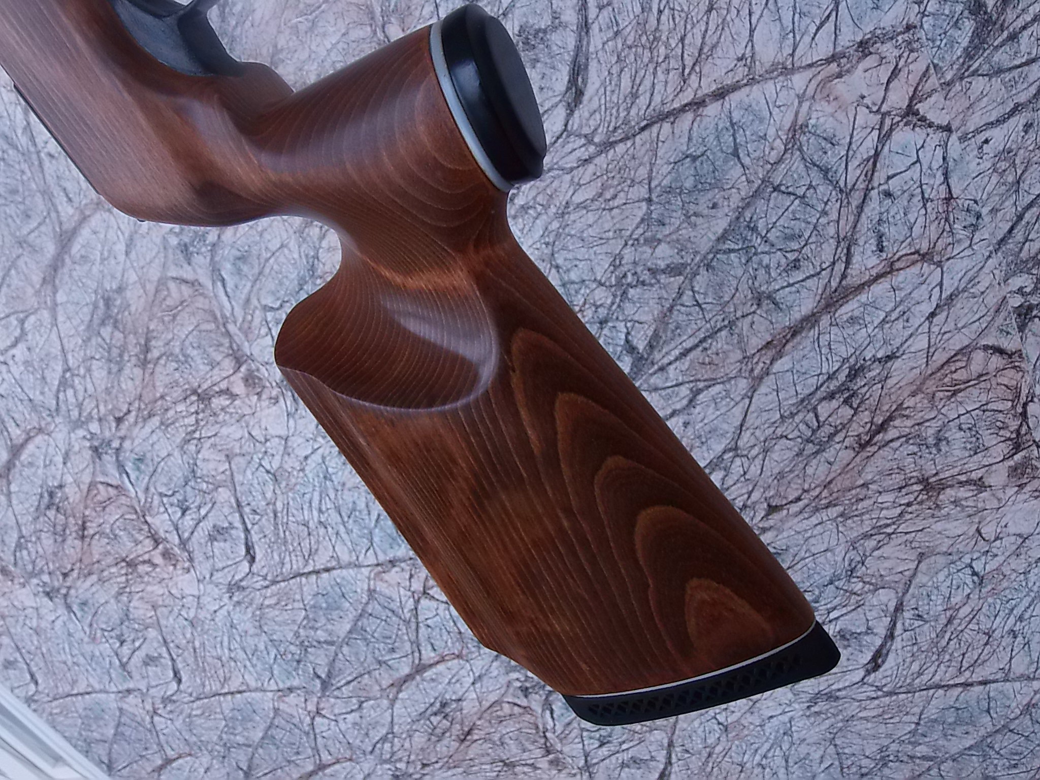 Итак… «Железо» было практически уже доведено до нужного уровня.Полную сборку железяк отложил-ведь нужно делать было ложу для винтовки,а примерять железяку в ложу, постоянно хватаясь пыльными руками за неё не хотелось.Потому компрессор оставил именно пустым под примерку.Ну а ложу применил имеющуюся в заначке. Купил на барахолке ложу от «Кубика» как-то.В целях было приладить в неё «Крысу». Но к сожалению не вышло-даже отпиленная до возможного крысоручка не позволила этого.Вот и лежала она дожидаясь «звёздного часа» своего.Воспользуюсь фото продавца-к сожалению сам забыл сделать.Ложа кстати не орех!!!Это бук,но весьма качественный и красивый!В любом случае шкурить её нужно было-на ложе было несколько глубоких выбоин и трещинка: