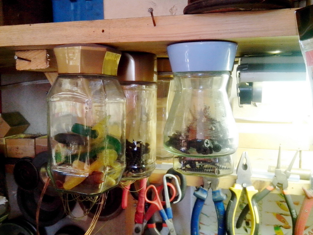 В моей мастерской довольно много всякой всячины, а места не настолько много, чтобы всё разложить по полочкам. И вот как-то лазил я по инету и наткнулся вот на такой способ хранения разных мелочей...: