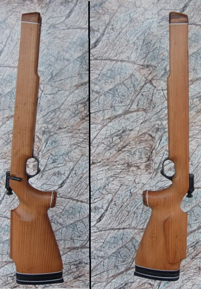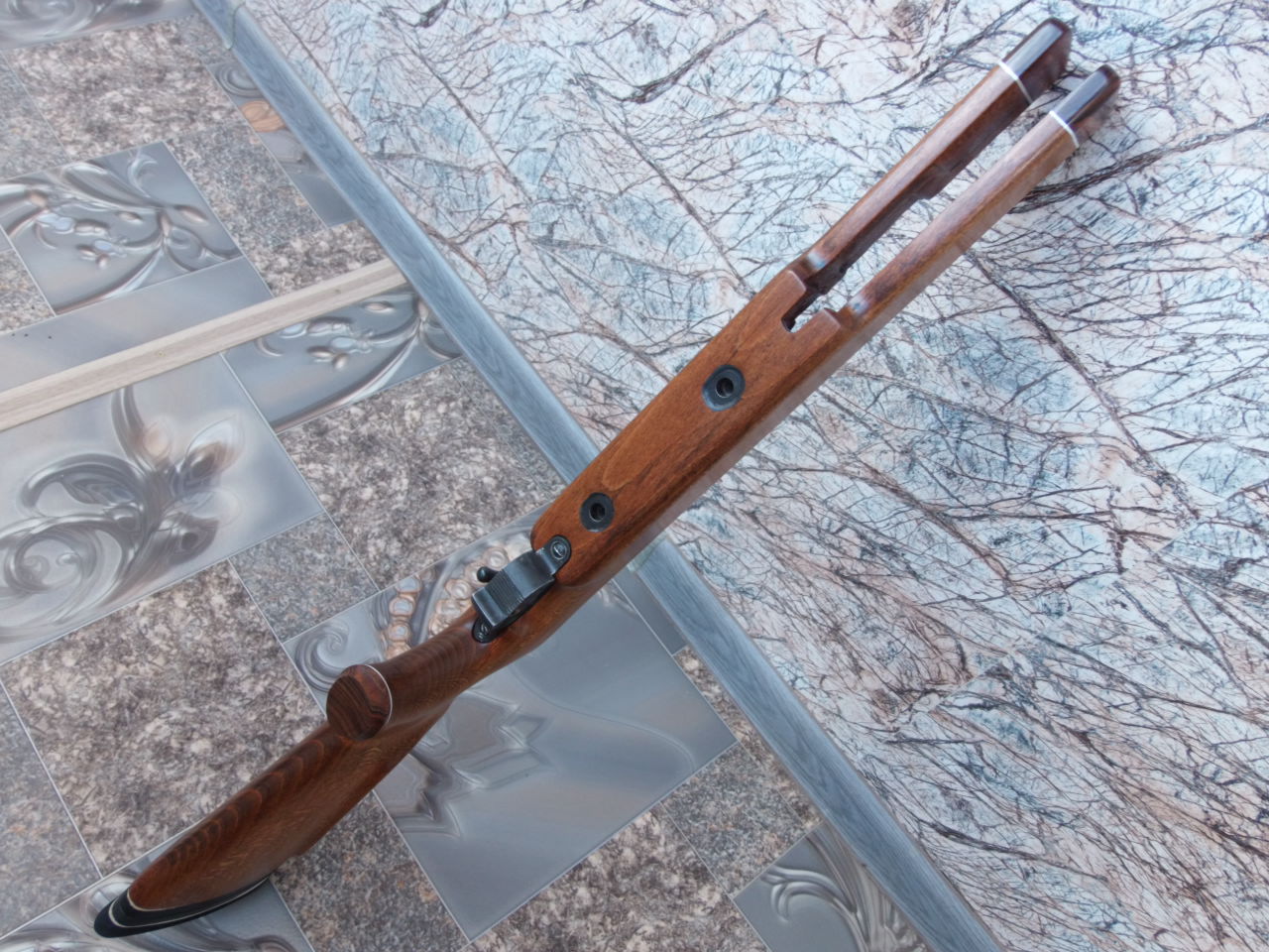 Покрытое ржавчиной железо было обильно покрыто аэрозолью WD-40,оставлено на отмокание на сутки.После протёр всё обработанное мягкой тканью,затем обрызгал нейтральным ружейным маслом.Спустя ещё несколько часов протёр всё насухо.Итог-ну практически идеальным стало всё «железо». Ну а к тому времени нашлись некоторые детали в компрессор на замену.Приехали ко мне манжета новенькая с перепуском,пружина новая,стальная телескопическая направляющая /утяжелитель, ну и старенькая ложа от юниорского «Зуля» с затыльником и спусковой скобой.И вот таким стал весь наборчик к «Мурке»: Затыльник был в не полном комплекте.Требовалось его доработать.О этом чуть позже,а сама ложа была вот в таком неприглядном состоянии: Выборка родная конечно же «Мурке» не подходила.Потому кроме внешнего апгрейда,требовалось адаптировать ложу «Зуль» под нашу «МР-512». Ну и конечно же внести некоторый «марафет» в сие изделие: Первым делом всё было обработано шкурками разной зернистости на оправках. Скажу честно-на этот раз попотеть пришлось изрядно,очень не хотелось ей легко отшкуриться.Материал ложи-бук. Что самое интересное-заготовка для ложи каким-то немцем была выбрана едва ли не симметричная.Будто именно середина бревна букового была выпилена в брус (доску) для этой ложи.В общем отшкурил: Обработал далеко не на чисто-это не требовалось,так как работы с клеями ещё предстояло,счищать его впоследствии нужно было бы снова.Порадовало,что кроме прямолинейной текстуры вскрылись характерные для бука мелкие тёмные риски и тигровые вкрапления.После пропитки это как бы обещало дать красивую и интересную «палку-буратинку».К слову не ошибся!!!Ну о этом будет ниже…