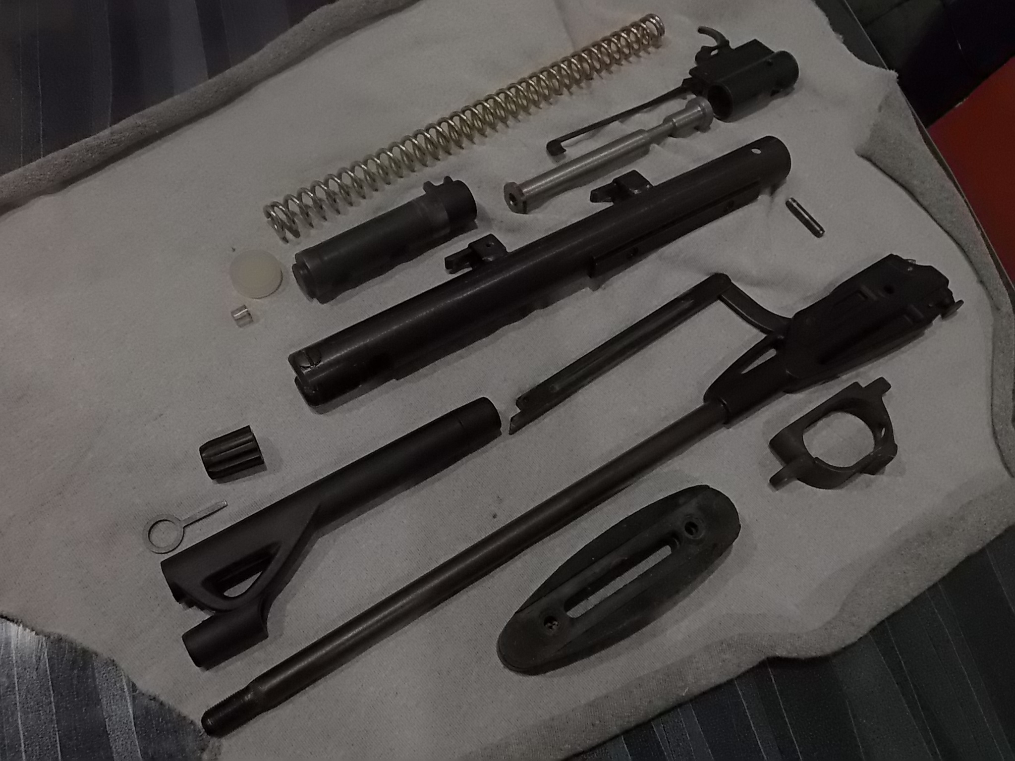 Покрытое ржавчиной железо было обильно покрыто аэрозолью WD-40,оставлено на отмокание на сутки.После протёр всё обработанное мягкой тканью,затем обрызгал нейтральным ружейным маслом.Спустя ещё несколько часов протёр всё насухо.Итог-ну практически идеальным стало всё «железо». Ну а к тому времени нашлись некоторые детали в компрессор на замену.Приехали ко мне манжета новенькая с перепуском,пружина новая,стальная телескопическая направляющая /утяжелитель, ну и старенькая ложа от юниорского «Зуля» с затыльником и спусковой скобой.И вот таким стал весь наборчик к «Мурке»: