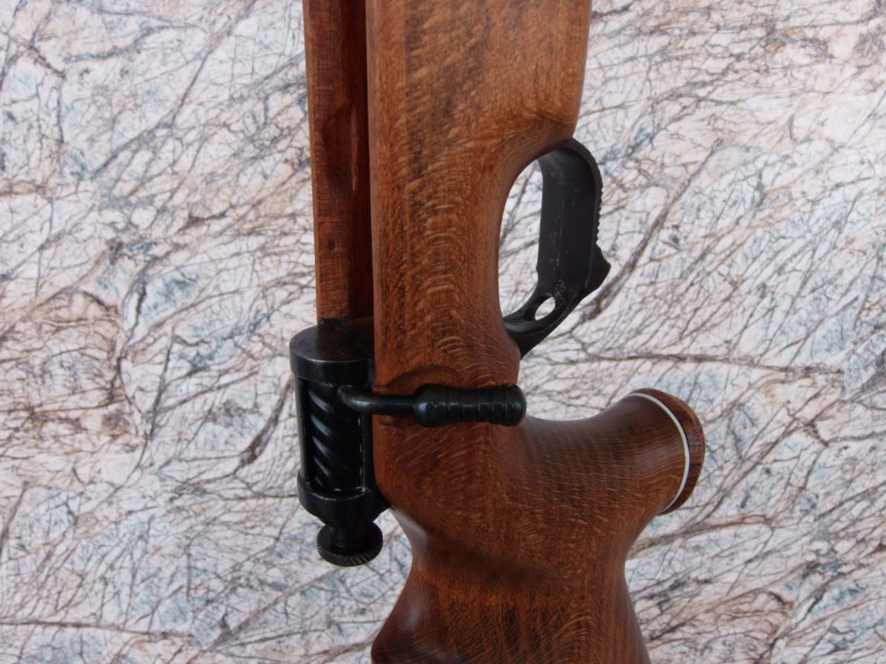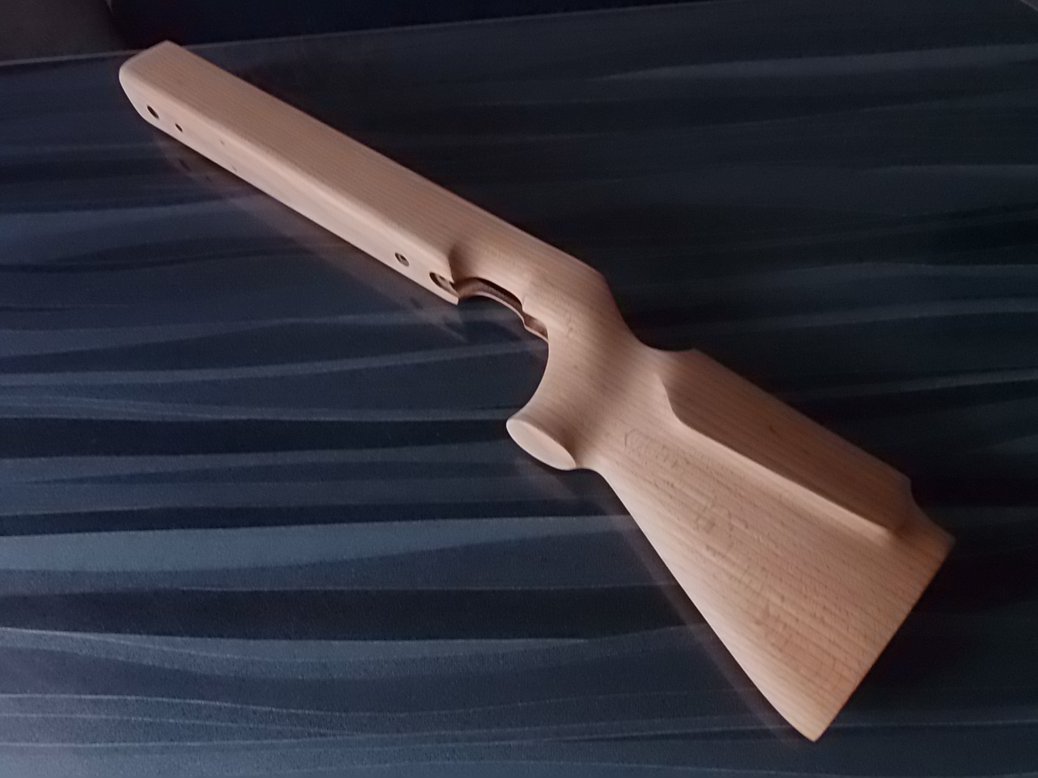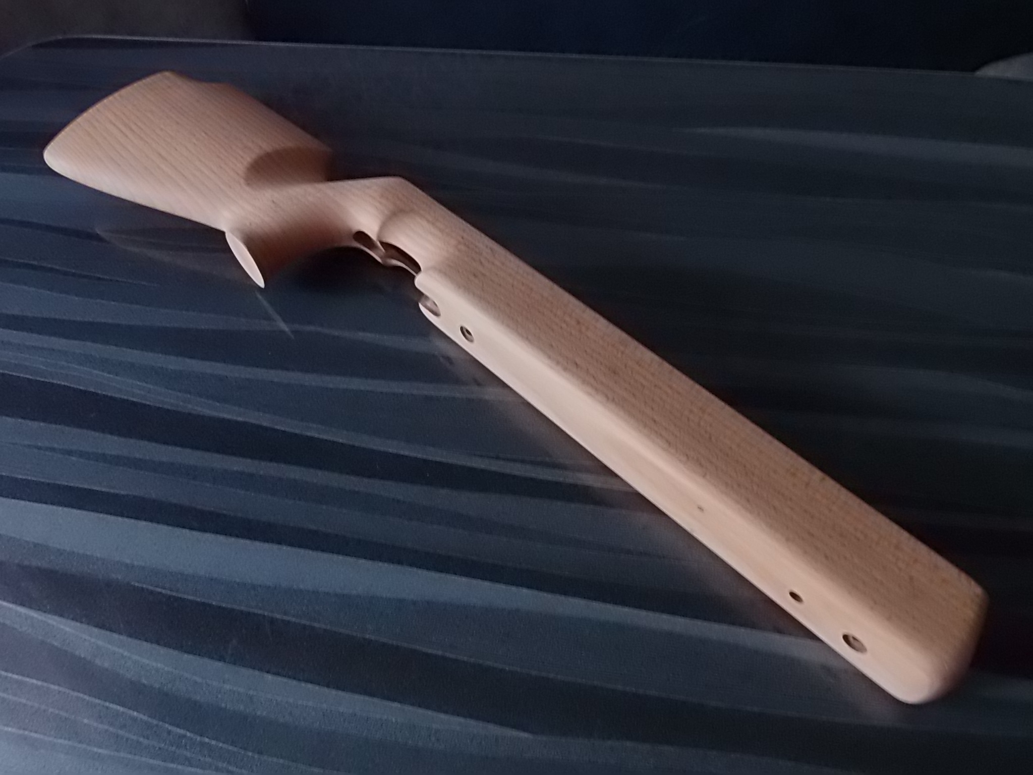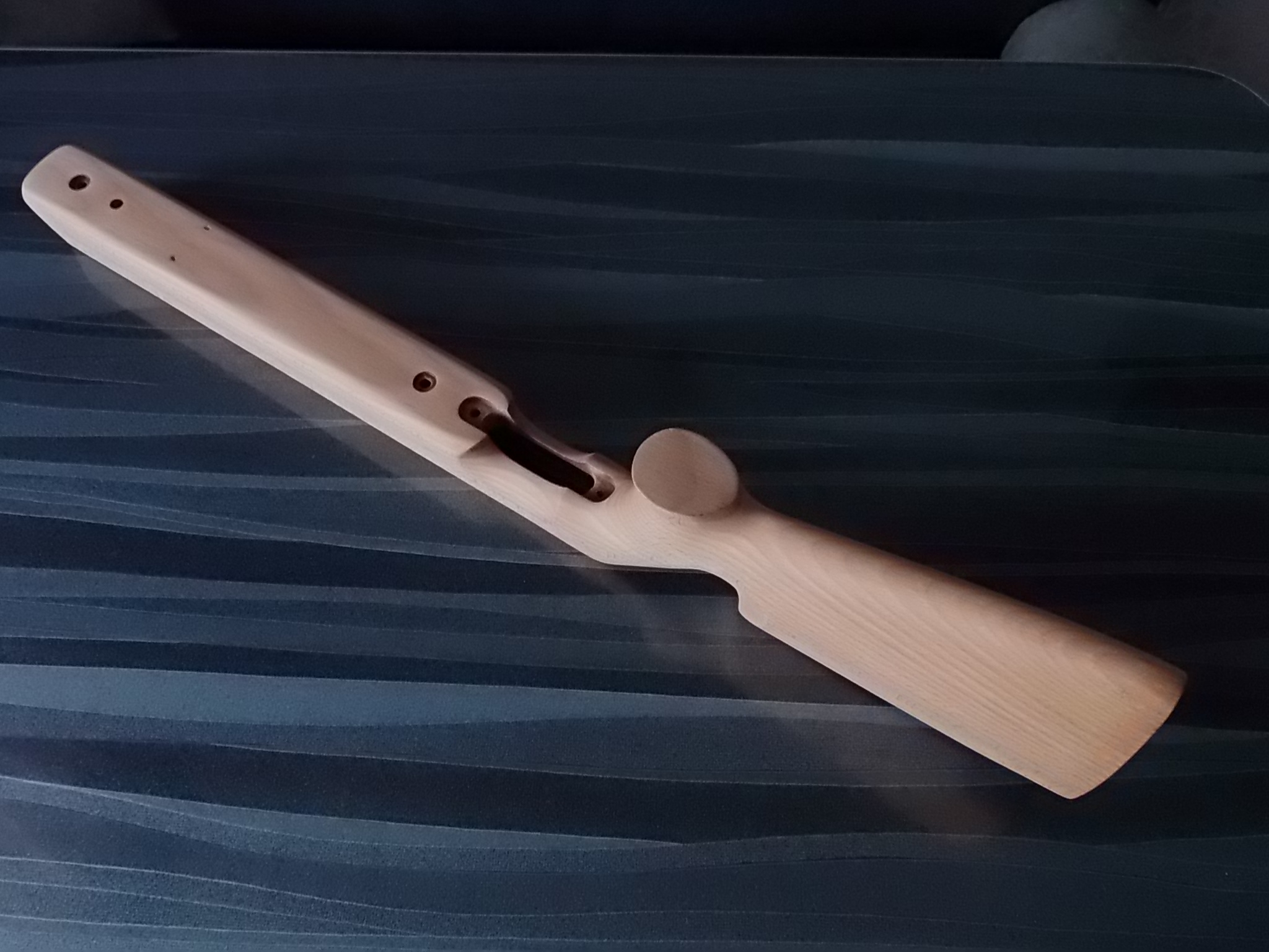 Досмотрел,что высота щеки приклада немного велика,да и острой она была.Потому буквально на сантиметр-полтора сделал её ниже,слева округлил под щеку стрелка,а справа сделав некоторую впадинку полукруглой стамеской слил с прикладом.Стало реально удобно целиться: