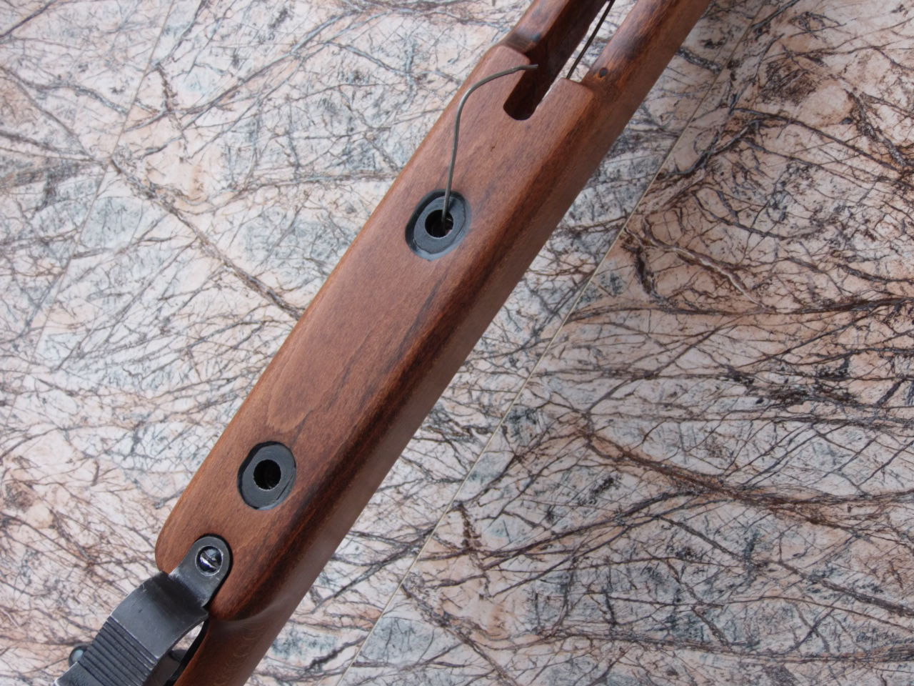 Далее принялся за доработку ложи в плане выборки под «Муркино железо». Решил воспользоваться для крепежа железа в ложе одним из отверстий,которые уже были в ложе-задним.Именно по нему далее шла вся работа.Да и «оттянуть» железо назад к шейке приклада не было возможным.Выборка под спусковую скобу была,а эта самая скоба и не давала спусковому крючку хода,если бы я подал УСМ с компрессором назад.Решено было так и поступить-оставил пустоту между задником компрессора и шейкой приклада.Там решил дополнить «картину» ещё одной деталькой.О ней позже…Боковины ложи доработал полукруглой стамеской. Предварительно отметил задник компрессора,совместив крепёж задний «Мурки» и отверстие в задней части цевья.Железо село в ложу,но опоры снизу не было: