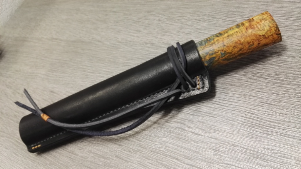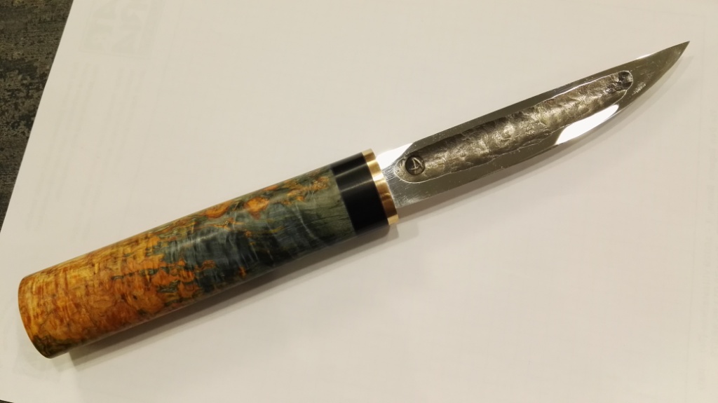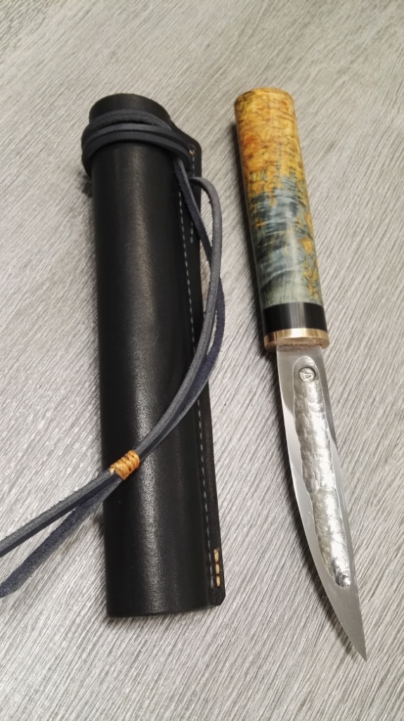 wildkokss писал(а):продам красавца якута, немного характеристик: клинок:автор Бондаренко сталь х12мф 135 мм длина, обух толщина 4мм, зонная закалка,твердость по обуху 54-55HRC ед, по РК 59-60HRC,выпуклая линза, полировка в зеркало, сведение 0,1, рукоятка стабилизированная карелка, бронза,эбонит, фибра, ножны дерево, кожа черная растишка от Мони, черный граб,синяя вощеная нить+синий кожаный шнурок, финиш карнаубский воск, длина ножа 270мм, в ножнах-290мм