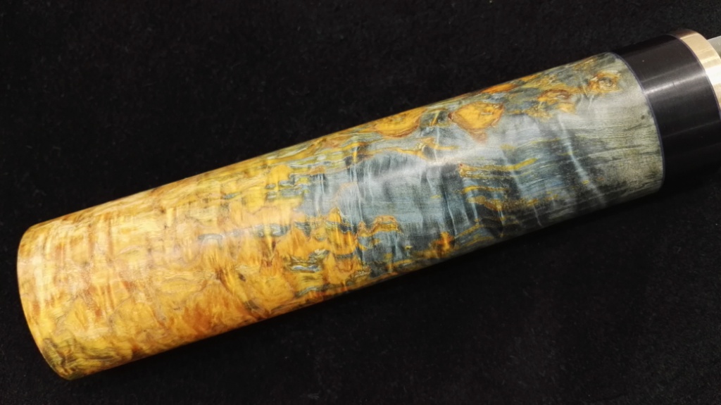 продам красавца якута, немного характеристик: клинок:автор Бондаренко сталь х12мф 135 мм длина, обух толщина 4мм, зонная закалка,твердость по обуху 54-55HRC ед, по РК 59-60HRC,выпуклая линза, полировка в зеркало, сведение 0,1, рукоятка стабилизированная карелка, бронза,эбонит, фибра, ножны дерево, кожа черная растишка от Мони, черный граб,синяя вощеная нить+синий кожаный шнурок, финиш карнаубский воск, длина ножа 270мм, в ножнах-290мм