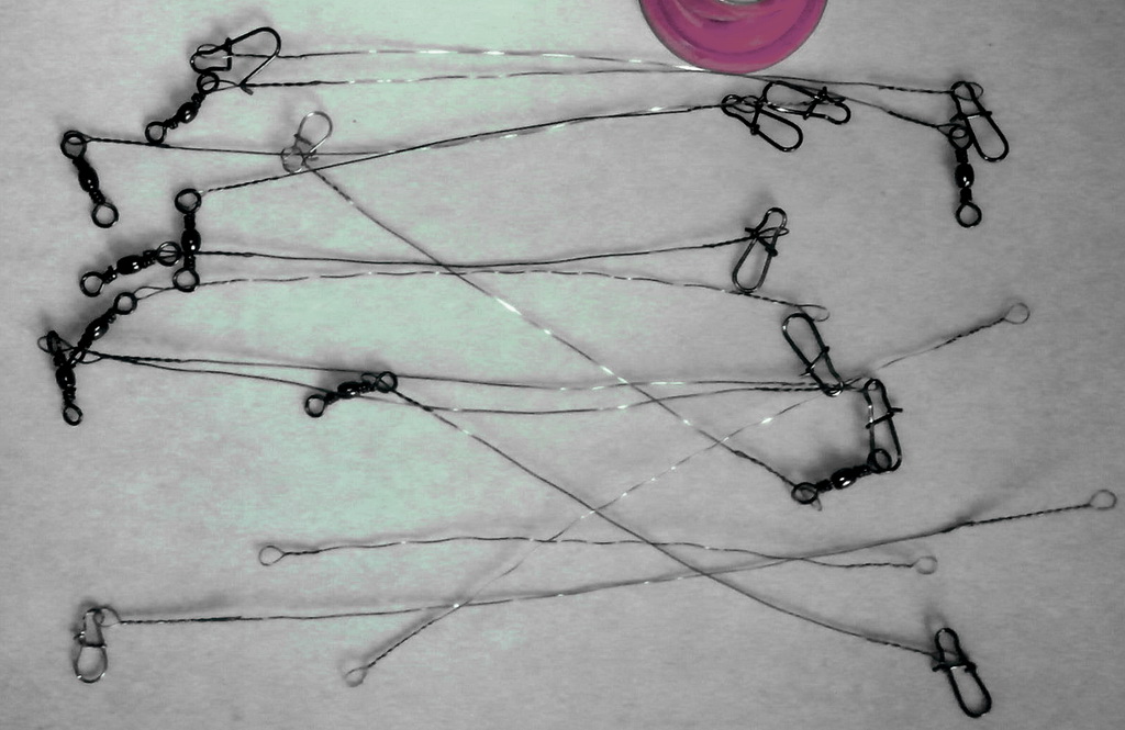 Поводки делаю из полевого кабеля, благо в нём имеются три стальные жилы из жёсткой нержавеющей стали диаметром 0.2 мм...
