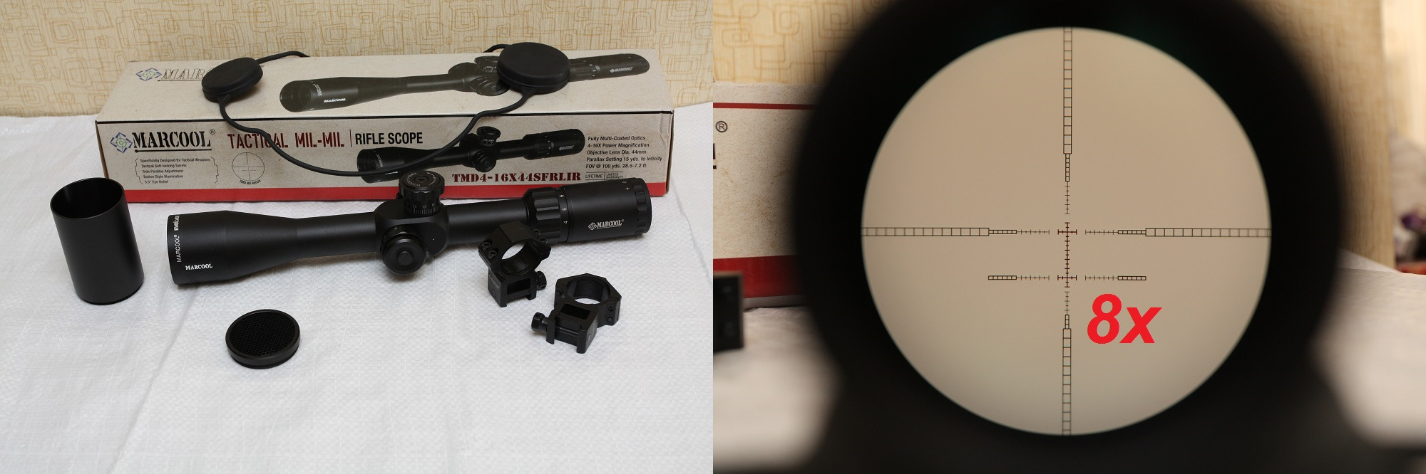 Легкий и компактный.Кристально четкая картинка, Сетка MAR-028 гравированная на линзе, многослойное оптическое просветление Объектив 44мм, Увеличение крат: 4-16х, Труба 30мм цельная, Сетка гравированная на линзе.