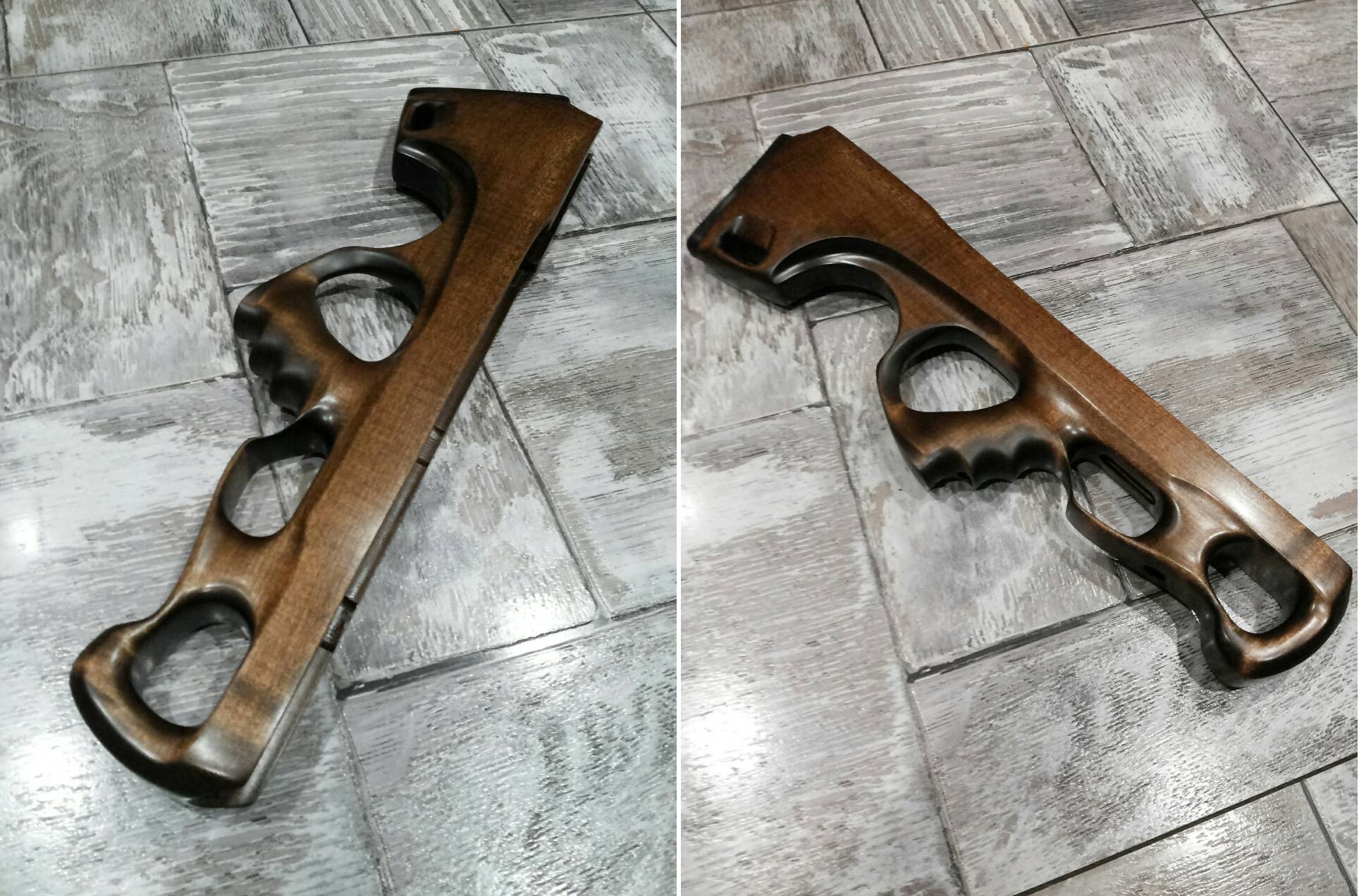 Дал сутки на сушку клея, далее приступил к пропитке ложи. Для этого сначала взял льняное отбеленное масло. Был у меня остаток его-вот и применил. Старательно первым слоем натёр ложу,дал некоторое время впитаться маслу. Затем излишки вытер сухой тряпкой и отправил ложу на сушку. Первый слой сох дня три. После применил уже льняное уплотнённое масло. Оно более густое,плотное по сравнению с отбеленным. Ну а так как отбеленное высохло в порах древесины-стало своего рода грунтовкой,то уплотнённое уже не так интенсивно впитывалось в ложу. Оно конечно разжижало высохшее отбеленное в порах,питало древесину,но не с такой жадностью как при нанесении первого слоя. Всего было нанесено два слоя уплотнённого с интервалом в сутки. После отправлено на сушку на 5 дней. Вот такой была ложа после: