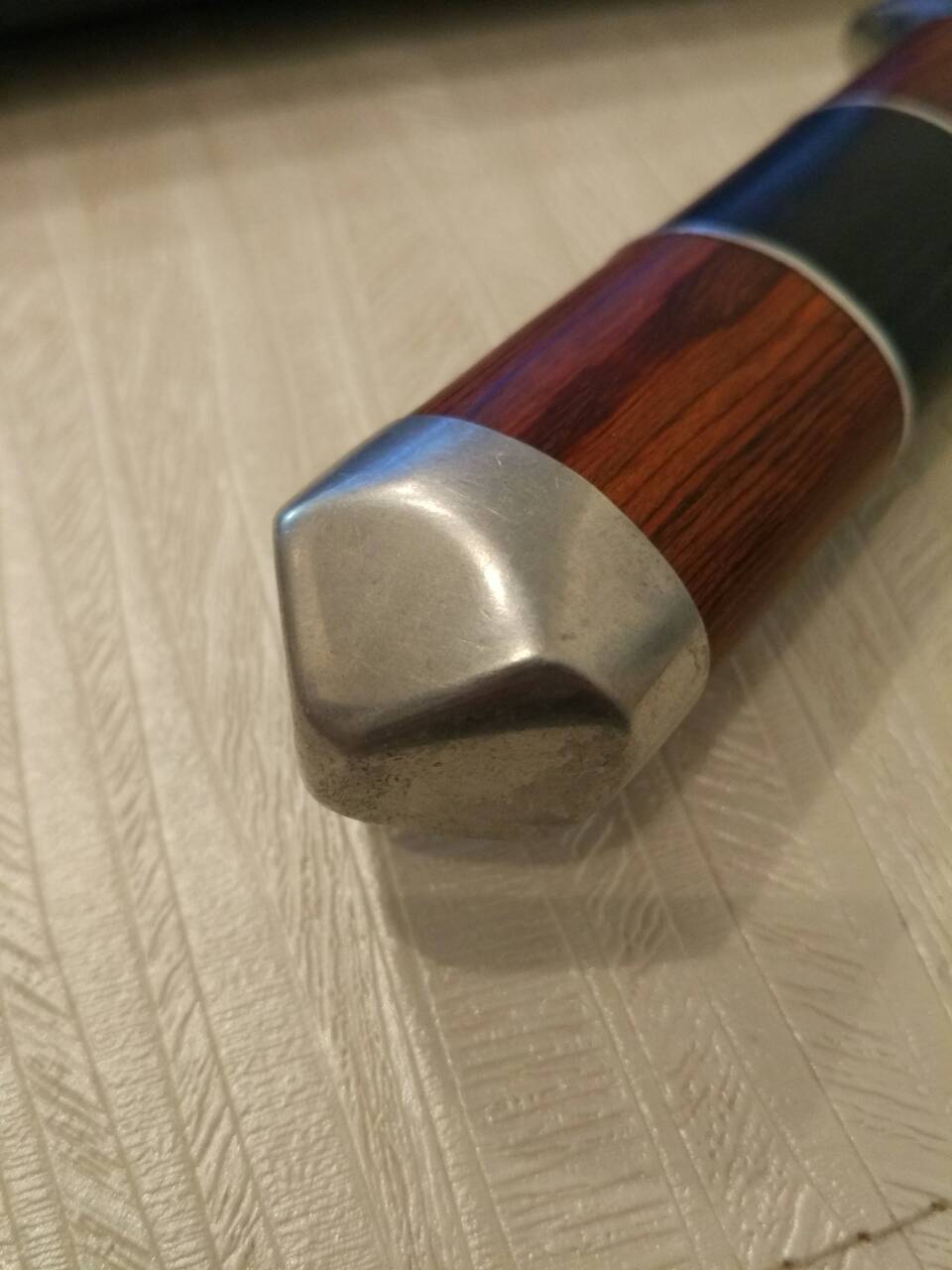 Дрель или шуруповерт то у тебя надеюсь имеется ? Можно обойтись и без тисков, положив нож на доску, и приложив вторую поверху вкрутить с двух сторон по шурупу. Или по нескольку шурупов, в зависимости от того насколько сильно зажать нужно. Ручку предварительно замотать чем нибудь во избежание случайных сминаний или царапин. Аккуратно накернить и просверлить для начала более мелким сверлом. Потом рассверлить нужным диаметром. Судя по фото, в балдавешку на ручке внутри вкручена резьба хвостовика на котором держится ручка. Так что будь поаккуратнее. Если это так, то мелкое сверло при входе в середину толщи балдавешки может закусить и сломать. Чтобы этого гарантированно избежать, на шуруповерте можно настроить трещетку. Но шуруповертом, особенно если материал нержавейка, будешь сверлить долго и нудно.... :ne_vi_del: