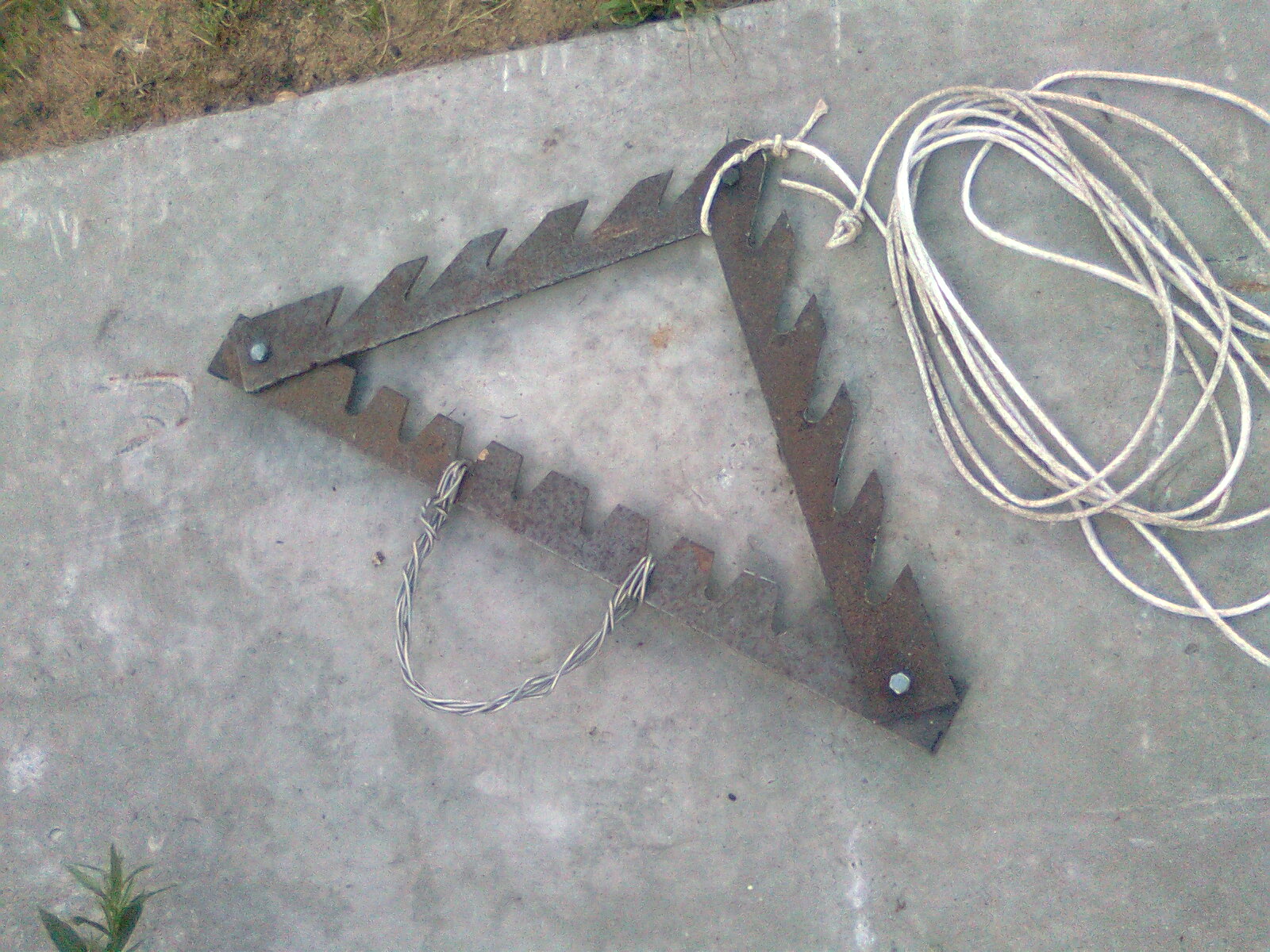 Вышли как-то раз с внуком на местный деревенский прудик - карасиков для кота половить и нарвались на полный облом :ny_tik: . Водоёмчик полностью до самой поверхности заполонили водоросли - удочку забросить просто некуда :cry_ing: . Пришлось в срочном порядке создавать косилку для водорослей . Идею стырил в интернете , инструмент и железо нашёл в сарае . После первого испытания пришлось добавить проволочную ручку - с ней гораздо легче стряхивать вытянутые водоросли :co_ol: . Рекомендую сию приспособу любителям попловочной ловли карасей и линей в густых зарослях водной растителоности :ti_pa: .
