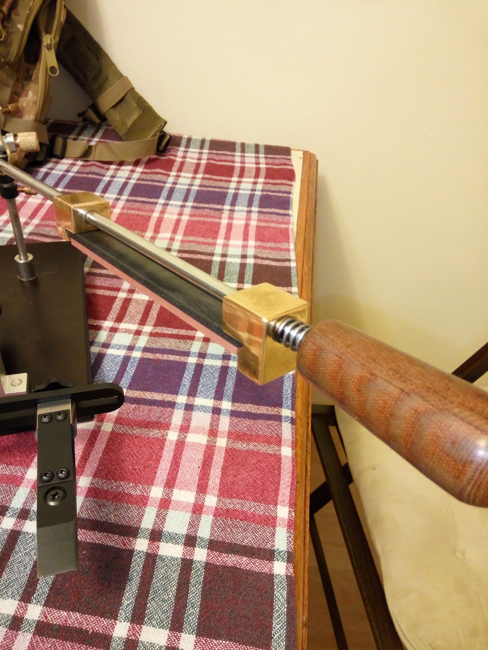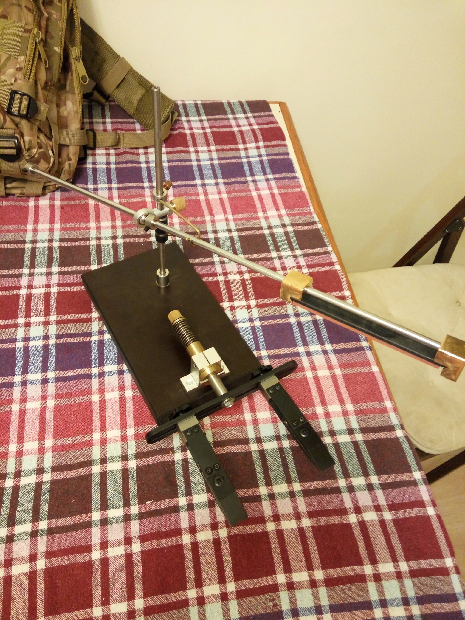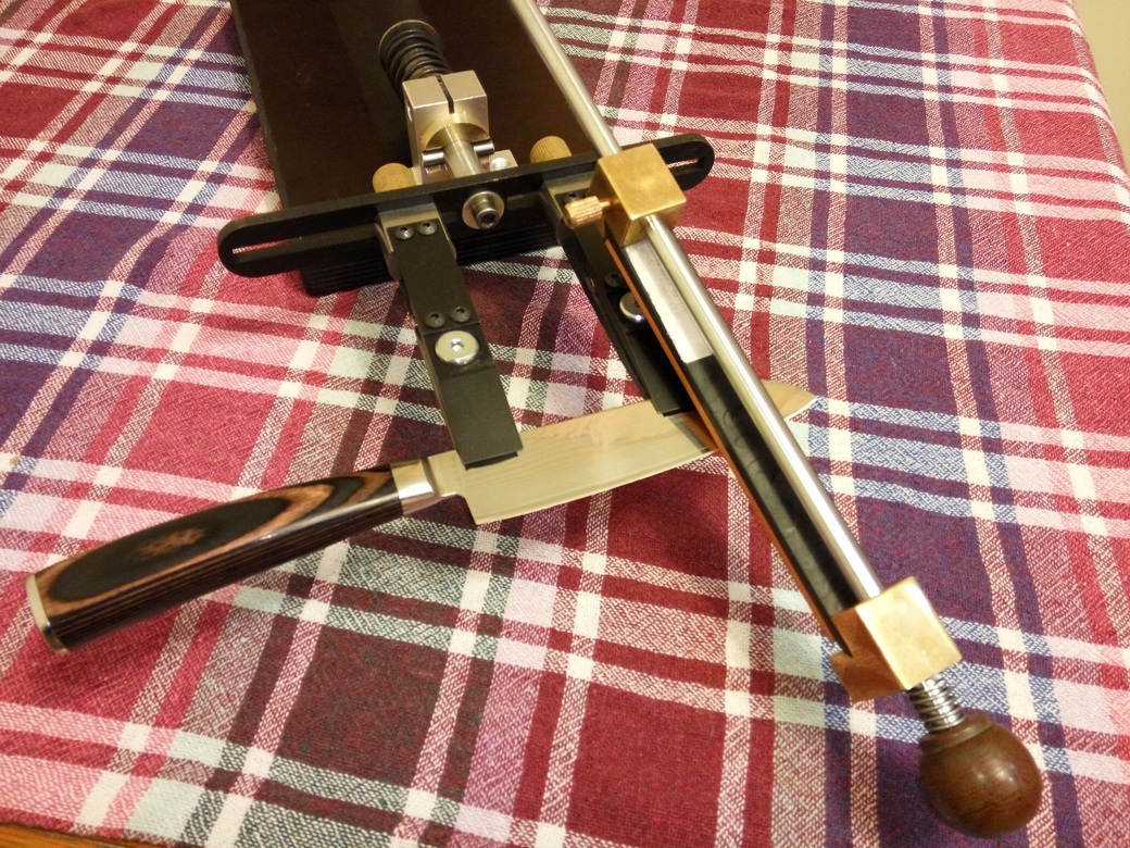 Точилка с поворотным узлом аля "Ефим".Зажимы (пружины и губки) - 65Г. Направляющие штанги - GCr15 (аналог ШХ15), твёрдость - 58-60НR СОснование - ламинированная фанера.Широкий одиночный зажим и абразив - дополнительные опции, в стоимость не входят.