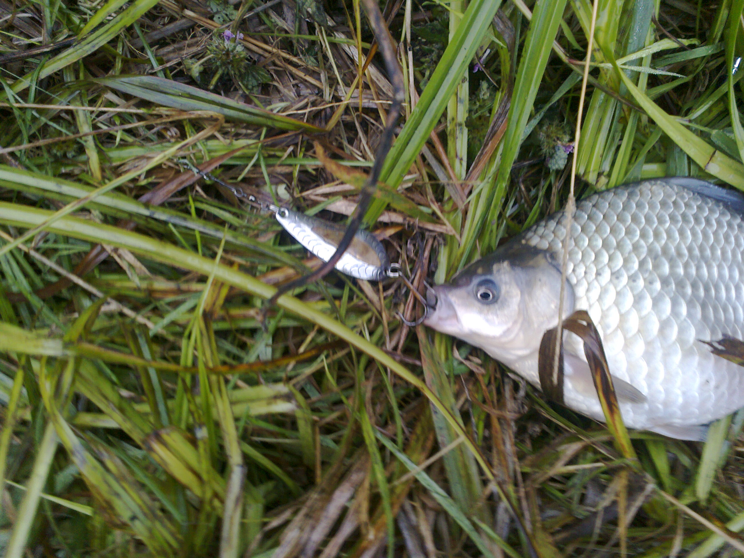 Мирная рыба – значит не хищник и на блесну не клюет, однако я сам поймал карася на довольно крупную колебалку. Если бы это случилось не со мной, никогда бы не поверил, посчитал бы рыбацкой байкой. Карасиха клюнула, как положено, ртом, при равномерной проводке блесны через место на пруду, где неоднократно были замечены всплески рыбы. За мою более, чем сорокалетнюю рыболовную жизнь, это второй случай поимки карася на блесну. Первый был при мне с моим другом Александром Федотовым. Семисотграммовый карась был пойман спиннингом на небольшую колеблющуюся блесну, но тогда карась отцепился в подсаке и мы не были на все сто, уверенны, что он клюнул ртом, а не забагрился за голову. Поклевка карася на мою блесну случилась 16 сентября. В этой самке оказалась перезрелая оранжевая икра вместе с незрелой серой – почему-то своевременно не отметалась, поэтому она такая толстая на фото.
