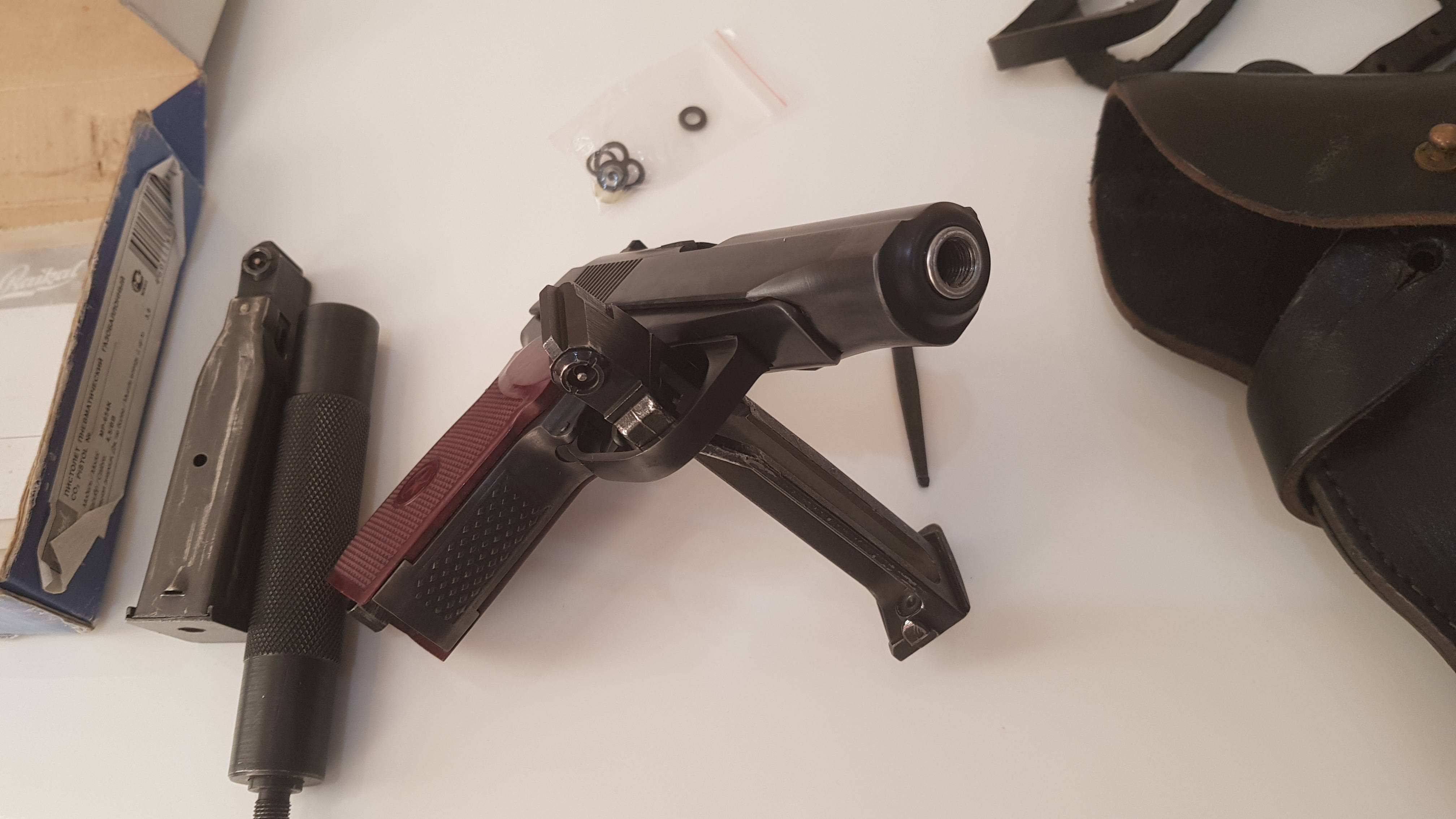 В комплекте сам пистолет, штатный магазин, магазин в корпусе боевого, удлинитель ствола в виде ПБС, кобура с тренчиком, ключик