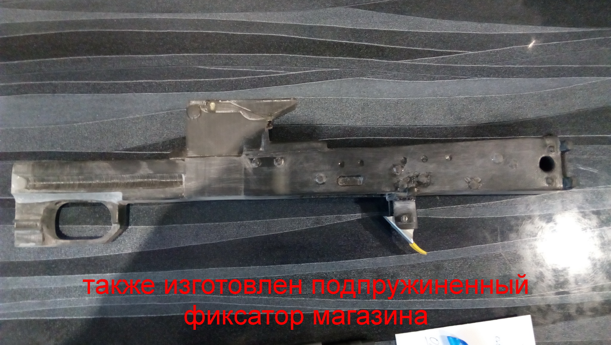 Крышка ствольной коробки была обрезана на 5мм. Тогда она становилась превосходно и фиксировалась кнопкой на боевой пружине. Также на винт закрепил переводчик огня. Он подвижен-при разборке чтобы снять затворную раму он опускается и рама беспрепятственно стягивается по направляющим назад: