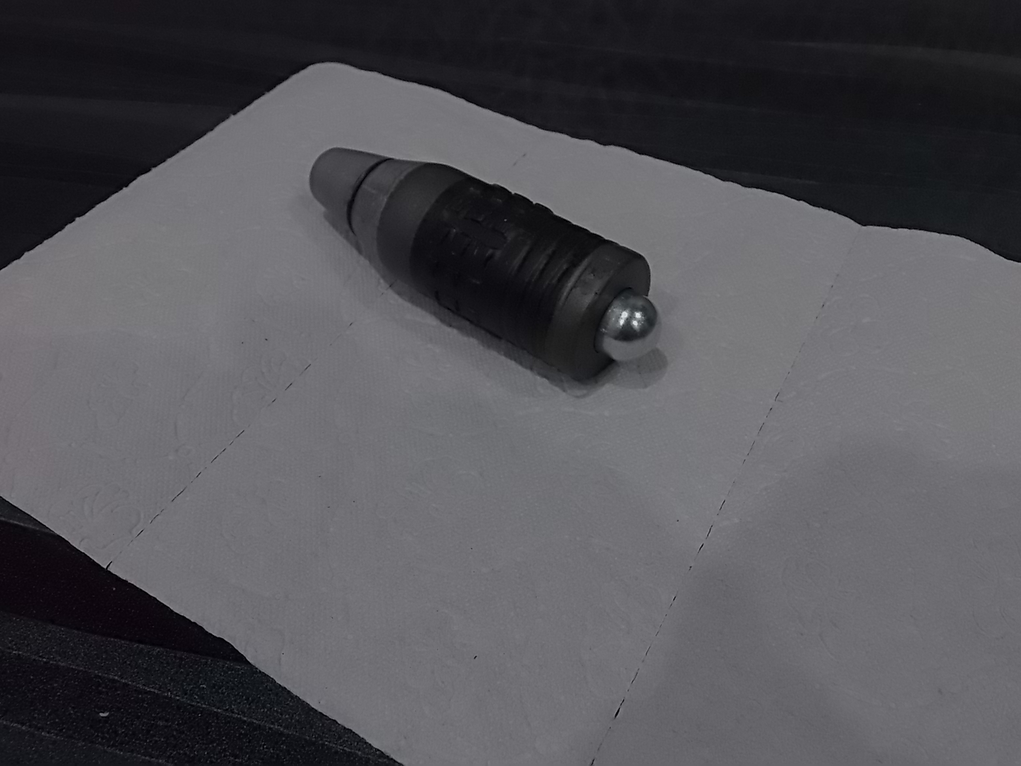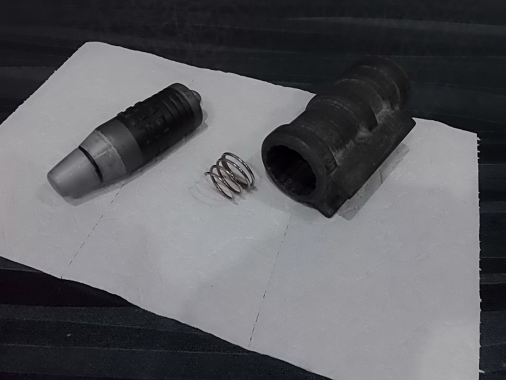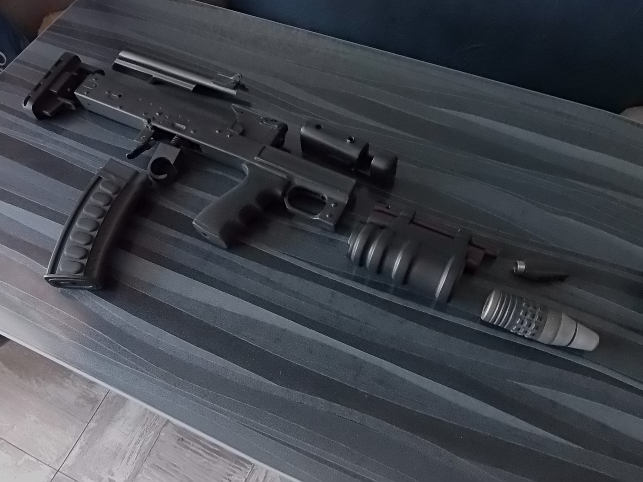 Работу с внедрением пенала в магазин отложил на время. Пока мудрил это,был мне прислан напечатанный к этому времени корпус подствольного гранатомёта и некоторое подобие гранаты для него ВОГ25П. Решено было сделать и эту «гранату» с определённым функционалом! А именно она должна была стать пеналом для запасного баллончика с кислотой! Чего ей просто так торчать в гранатомёте? Пусть хоть что-то полезное будет в ней!Верно? На «гранате» были сделаны типа нарезов элементы. Внутри корпуса гранатомёта также ответные нарезы. Т.е. граната-пенал вставлялась и извлекалась из трубы гранатомёта по направляющим «нарезам». Обрабатывал напечатанное как обычно-зачистка,шпаклевание,зачистка. Позже «гранату» окрасил после грунтования,придав ей некоторую состаренность пошаркав по ней 2000-0й наждачкой. Чтобы граната эта надёжно крепилась-в трубе гранатомёта вклеил подпружиненный шарик. В гранате также сделал углубление под этот шарик. В итоге-вставляем в задницу гранаты запасной баллончик,по отмеченному нарезу толкаем гранату в подствольник до щелчка! Щёлкнуло-значит граната в трубе зафиксирована. Она не выпадает оттуда,углубление под баллончик расчитано точно и в диаметре,и по длине. Никакого дребезга и шата ни гранаты,ни баллончика! Для надёжности вклеил внутрь гранатомёта мощную пружинку. Вышло всё как хотелось: