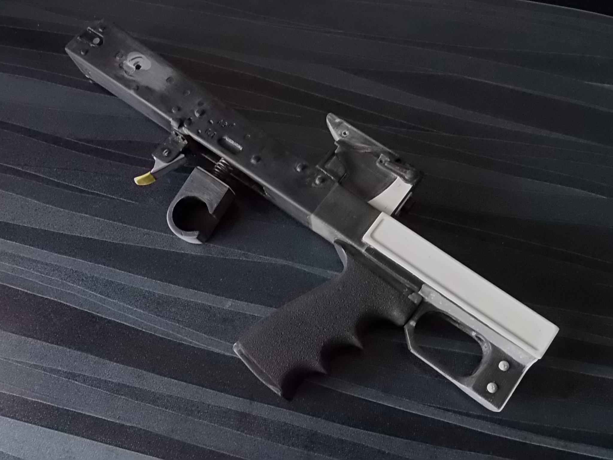 После этого добавил немного толщины в передке колодки целика приклеенными кусочками ПВХ пластика. Также сделал аккуратный торец тем же пластиком на корпусе под пистолет. Приклеил на ЭДП и притянул с внутренней стороны саморезом напечатанную эргономичную рукоять. Её я покрыл для удобства хвата мелкозернистым антигравием,оставив гладкие ободки сверху и снизу. Предусмотрел отверстие под взведённый затвор пистолета. Его облагородил вклеенной пластиковой трубочкой. С левой стороны в передней части скобы примудрил имитацию экстрактора гранаты из подствольника.Вышло так:
