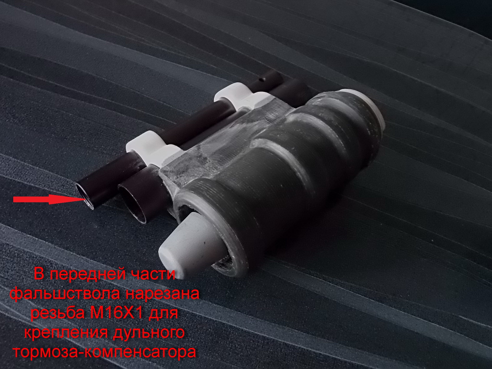 Дошла очередь до дульного тормоза. Его также нет в оригинале ОЦ-14. Ну какое-то окончание в виде кольца и не более. Я же хотел завершить ствол красивым ДТК. Ну и совместными с Русланом усилиями смудрили сделать такой. Моделировал и печатал Руслан. Назвать решили что-то вроде «Гремучник»-больно он похож очертаниями на голову гремучей змеи. Ну и после старательной обработки его,зачистке,шпаклеванию он был загрунтован,а затем окрашен чёрной матовой краской. Предварительно в задницу ему была вклеена втулка стальная с такой же как в фальшстволе резьбой-М16Х1. Спозиционировал её сразу так чтобы при тугом закручивании ДТК становился ровно по осям без перекосов. Ну а после основательной сушки краски немножко придал ДТК вида металлического,сделав немножко потёртостей и хорошенько натерев его 2000-ой наждачкой. Вышел вот такой «Гремучник»: