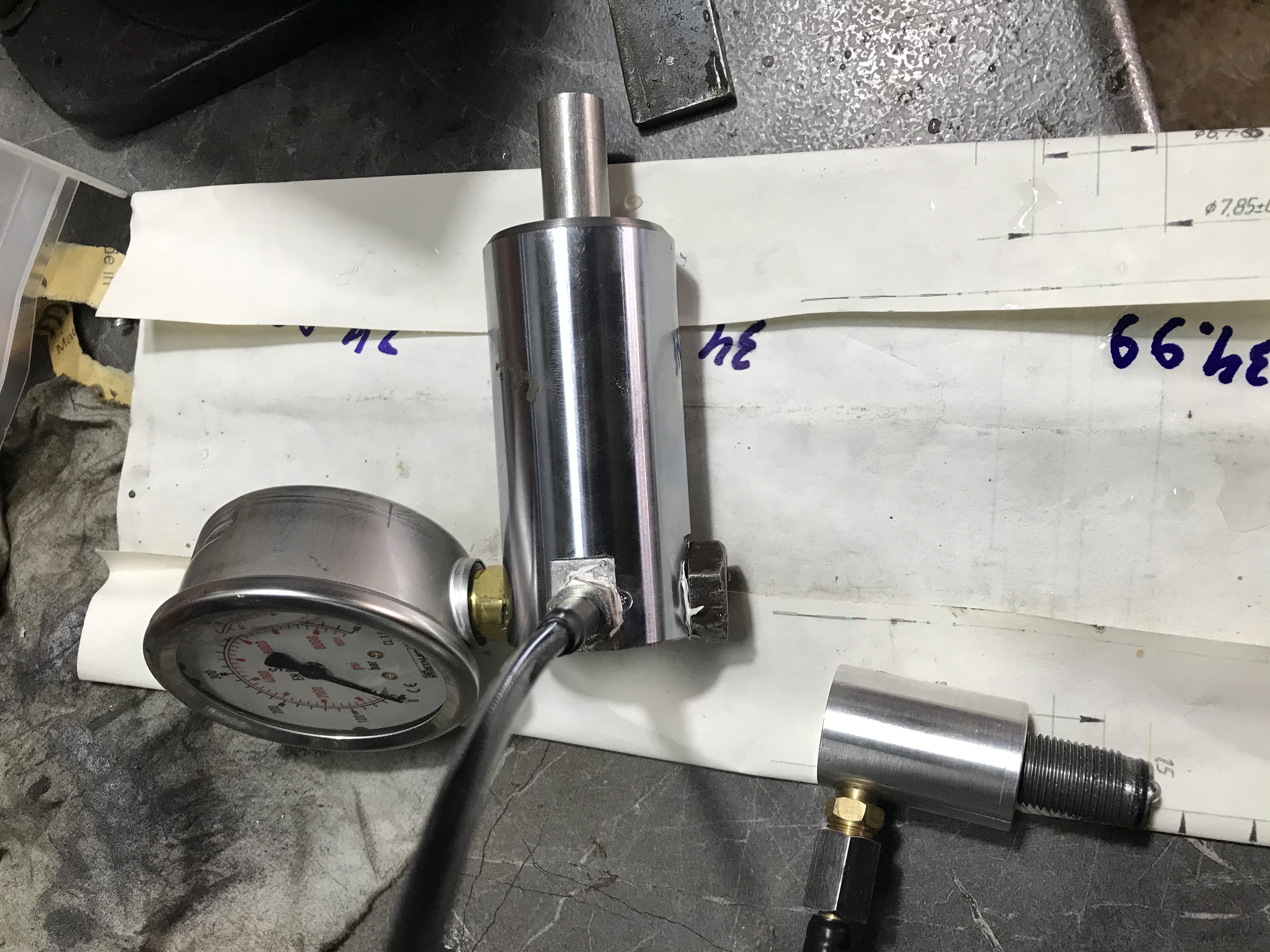 Просто, болванка с отверстием ф14 и штырь с резинкой. Мне так показалось проще, чем с домкратом мудрить. При 450 Резник раздулся на 4 сотки, после снятия давления вернулся к своему размеру. Ф35мм стенка 3,7мм д16т