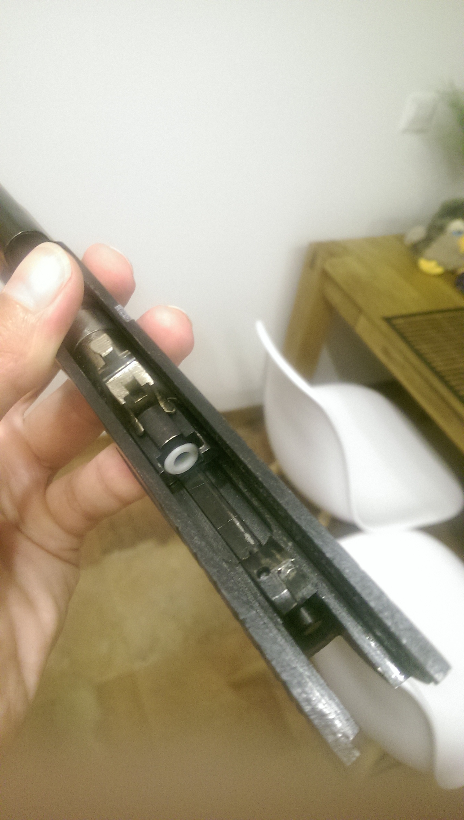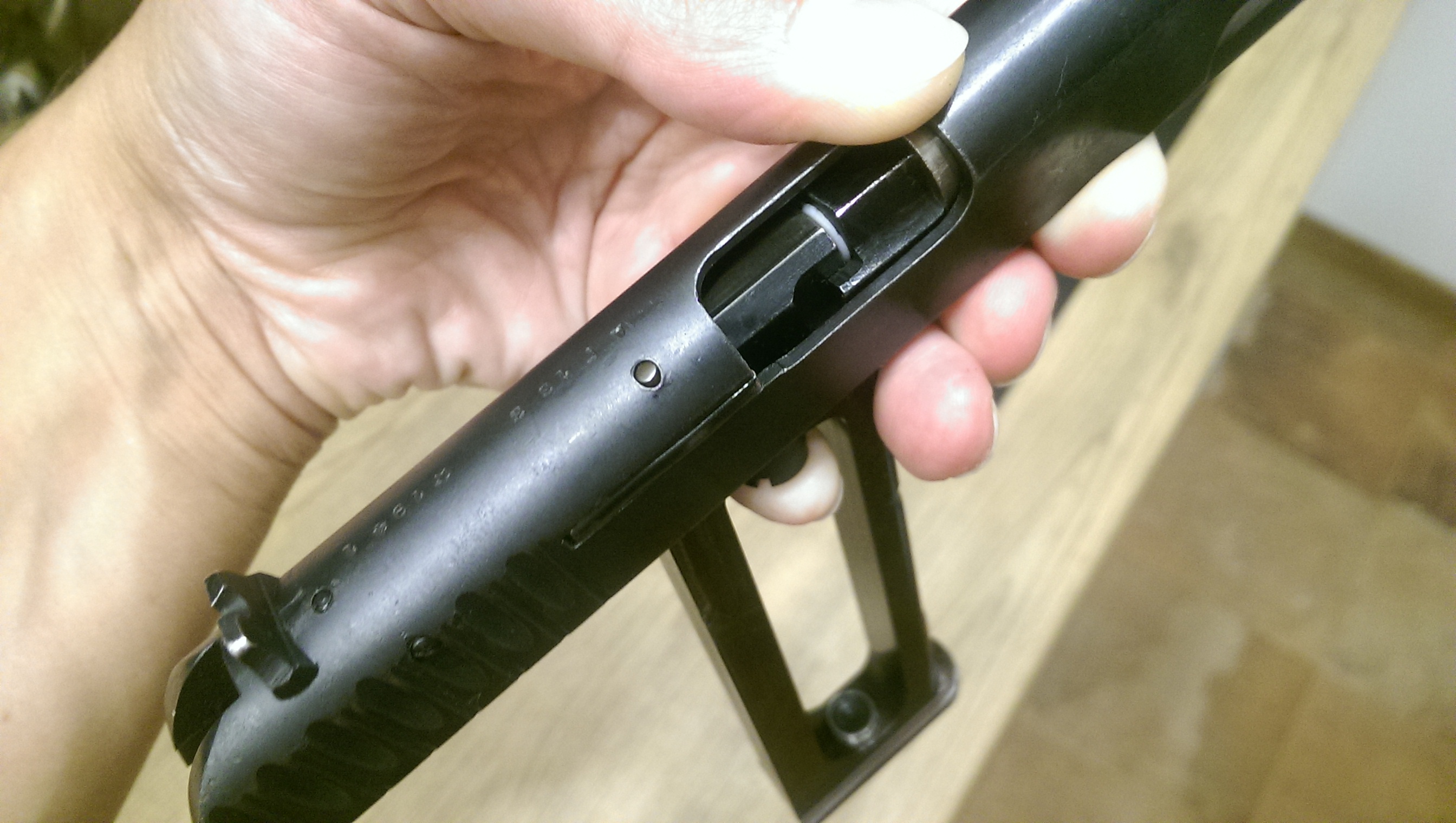 4. спилил гребень головы магазина, а в паз (куда гребень входил) в затворе вклеил металлическую вставку. теперь площадь контакта затвора с гайкой ствола больше, и затвор при сбрасывании с ЗЗ не уедет вперед.