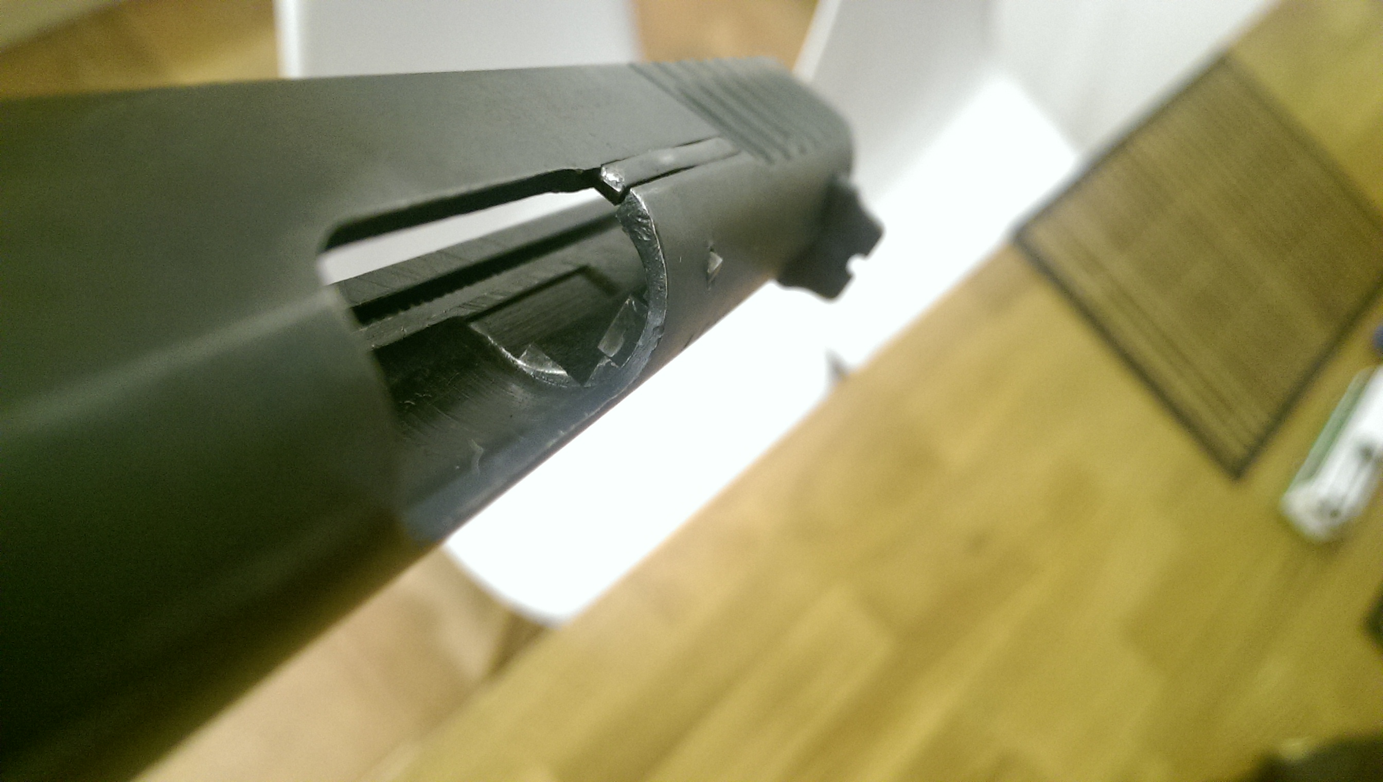 4. спилил гребень головы магазина, а в паз (куда гребень входил) в затворе вклеил металлическую вставку. теперь площадь контакта затвора с гайкой ствола больше, и затвор при сбрасывании с ЗЗ не уедет вперед.