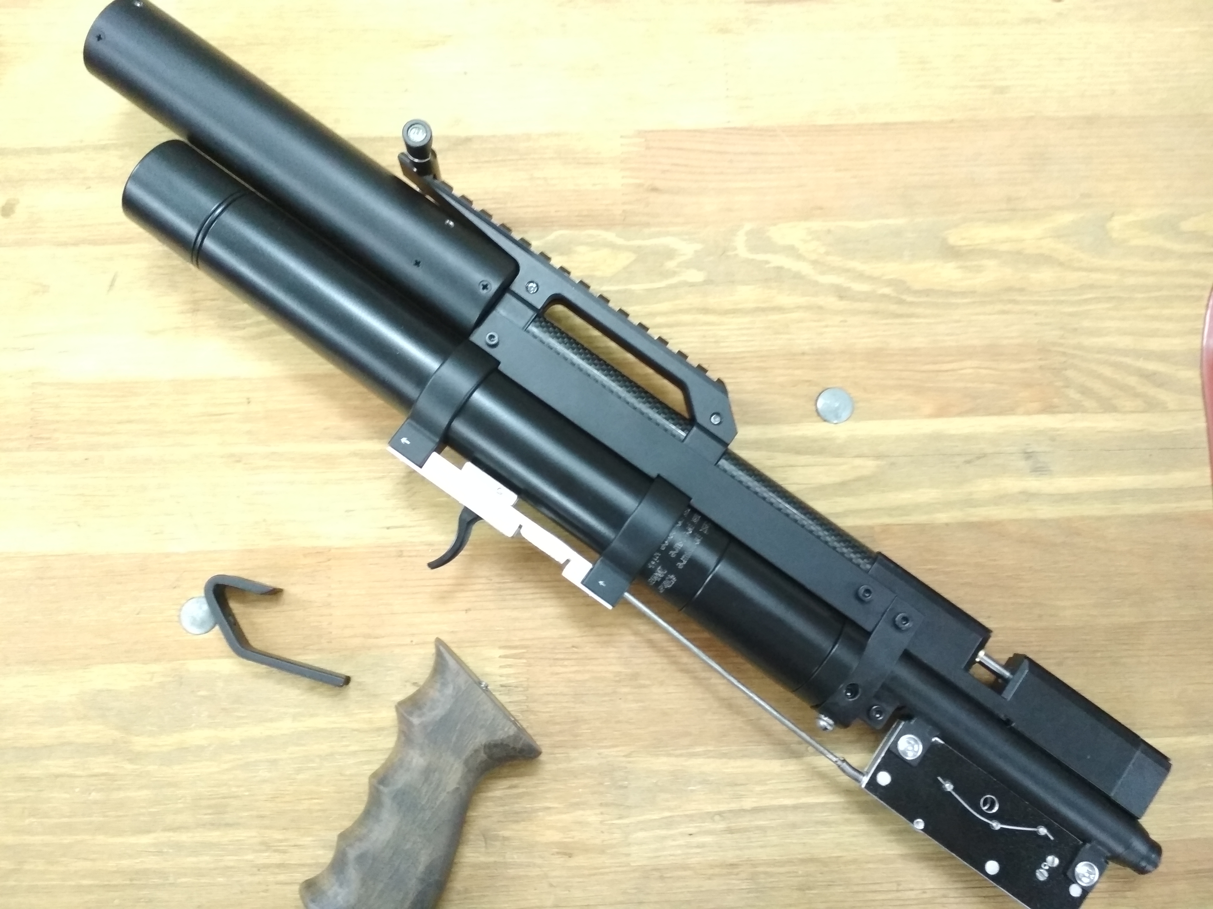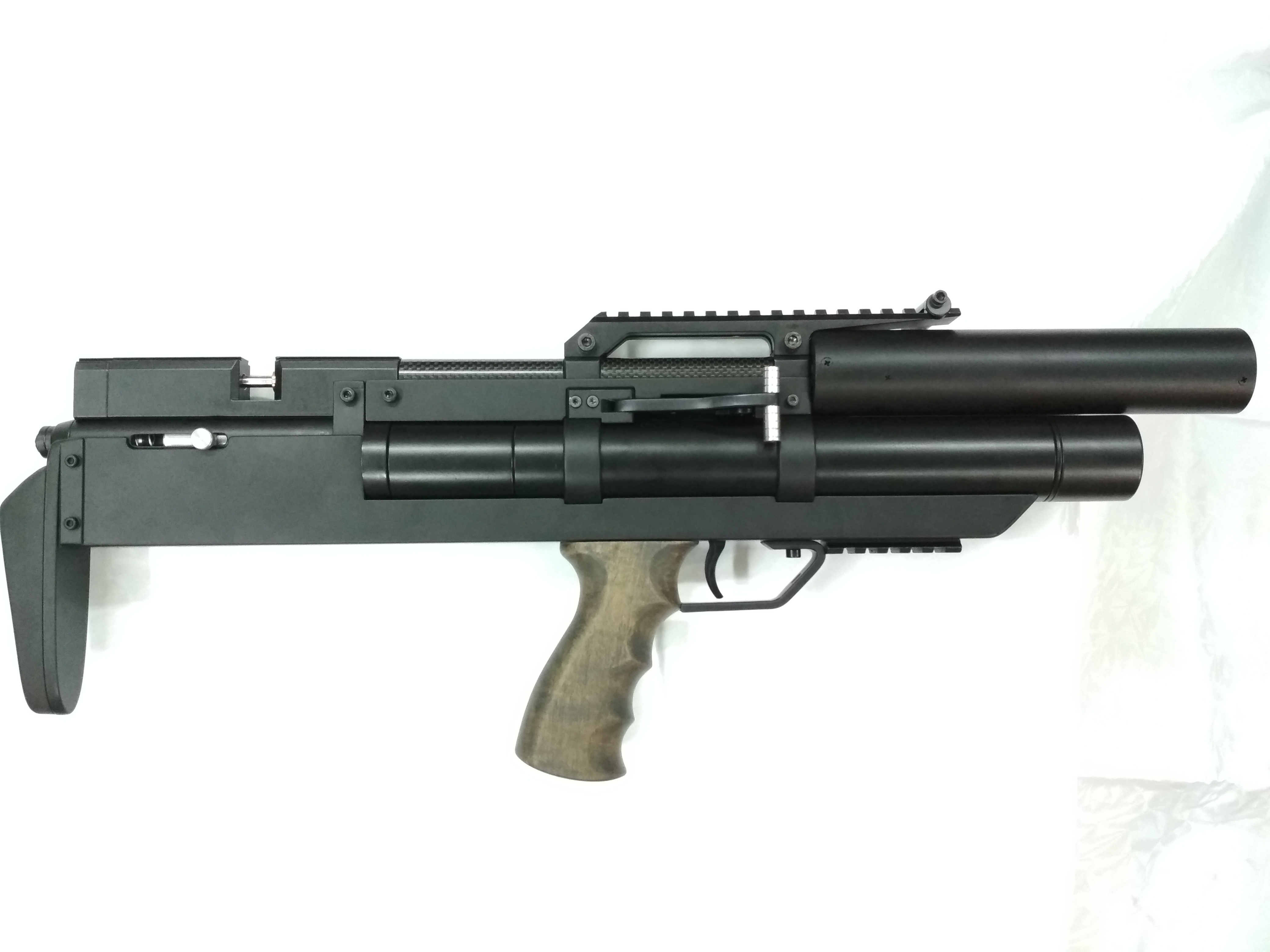 Продам булочку. Взвод биатлонный. перенесённый в переднюю часть. Малышка 55 см. , 5.5 кал. Всё собрано из аллюминиевых сплавов. Покрытие полимерное матовое. Резервуар ,редуктор Фёдора. Резьба резервуара старого образца. Редуктор, резервуар, пробки всё было куплено новое в 2018г. Бланк 34 см длинной, полигонал, двенадцать нарезов, нонейм. Бланк закрыт для защиты трубкой из углеволокна. УСМ построен по схеме Атомана. Спуск регулируемый, двухступенчатый. Спусковой крючёк для Егеря преобретён у Мурашки. Эргономически правильный и приятный, всем рекомендую. Рукоятка из груши. Установлен антибздун. Все 2.5 жулика выдаёт пополной. Редуктор настроен на 140 ат. Жсб хэви летят **60 км.ч. После перехода в прямоток скоростя сохраняютс до 120 атм. Скорость была настроена на оптимальную кучность бланка. Поскольку пострелять в закрытом помещении негде. То хвастать лазером не буду. Но на воздухе , с капота машины, на 50 м. Я три сантиметра собираю. Считаю что это хороший результат для данной компановки агрегата. В комплекте ничего не идёт. Только винтовка и магазин.