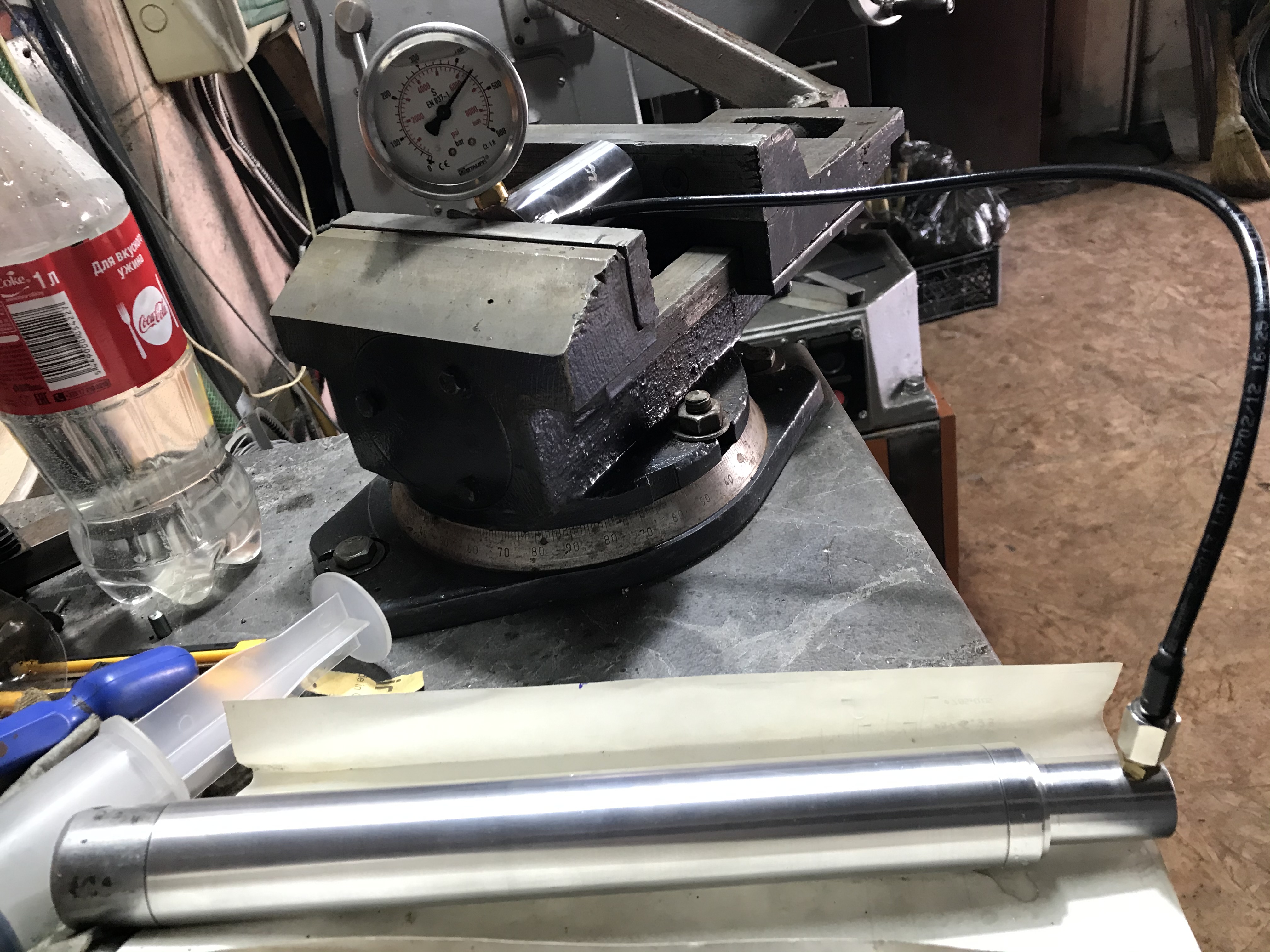 Просто, болванка с отверстием ф14 и штырь с резинкой. Мне так показалось проще, чем с домкратом мудрить. При 450 Резник раздулся на 4 сотки, после снятия давления вернулся к своему размеру. Ф35мм стенка 3,7мм д16т