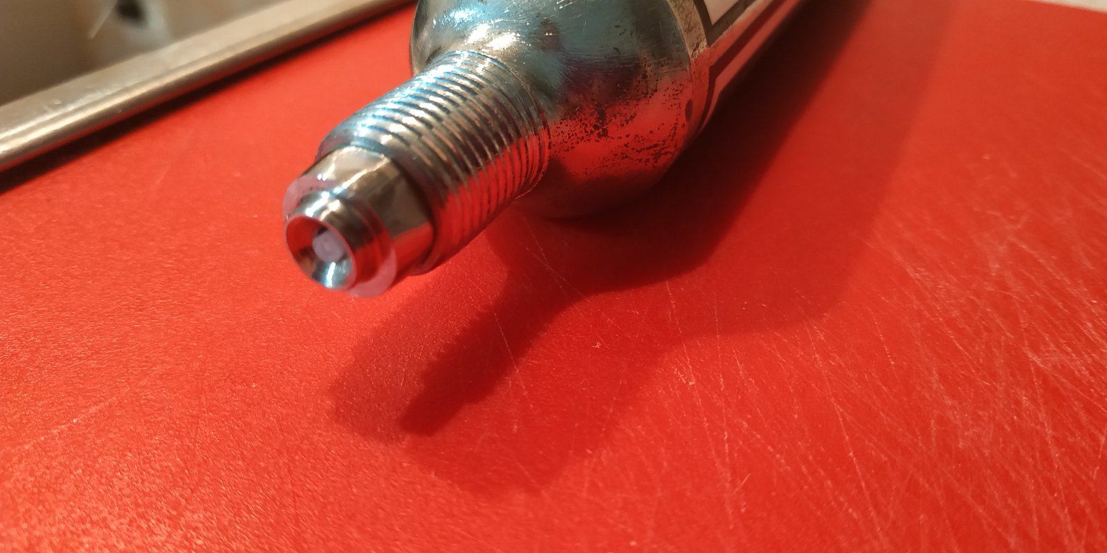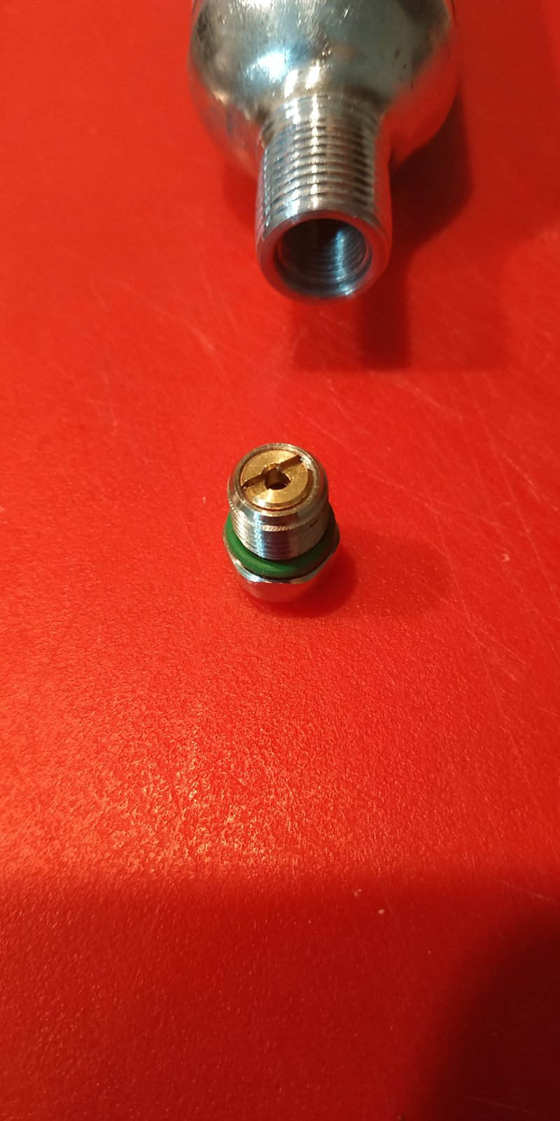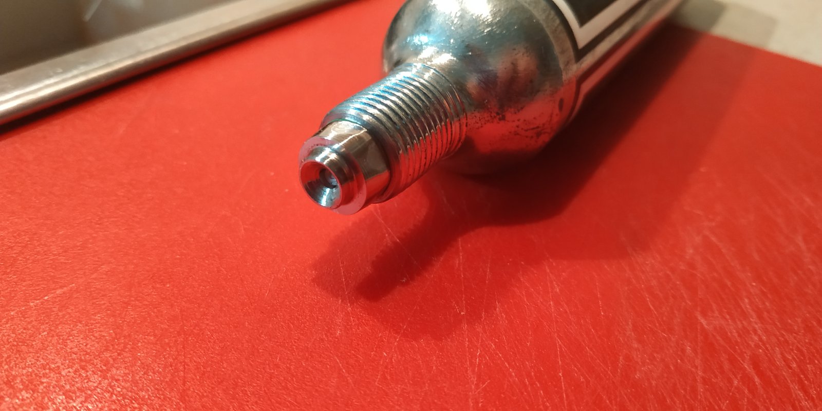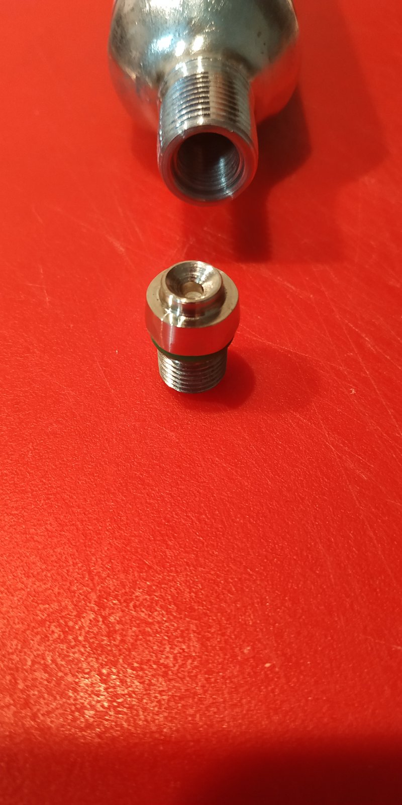 на балоне носик отрезан, заусенцы чутка вжикнуты, сделана канавка для резинки (похабно, с подручника - не достает у меня до того места каретка ... таки надо заняться станочком ...), нарезана ответная резьба М10х1 (метчиком. И надо сознаться - это была саааамая долгая операция - минут 20 мудохался