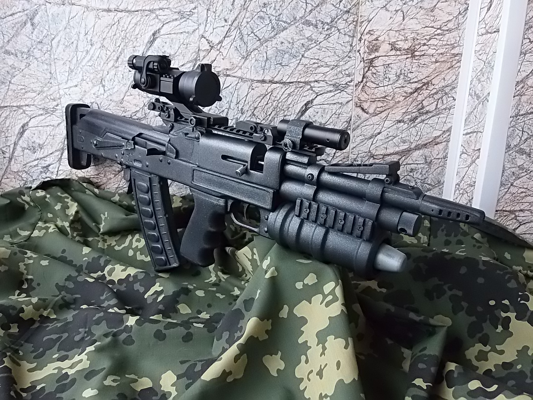 Сначала покажу версию с гранатомётом,сигнальным устройством и целеуказателем в разной комбинации прицельных приспособлений. Можно разумеется разместить пусковое сигнальное устройство и ЛЦУ на планках вивера над гранатомётом. Ну сделал фото в таком варианте их расположения.
