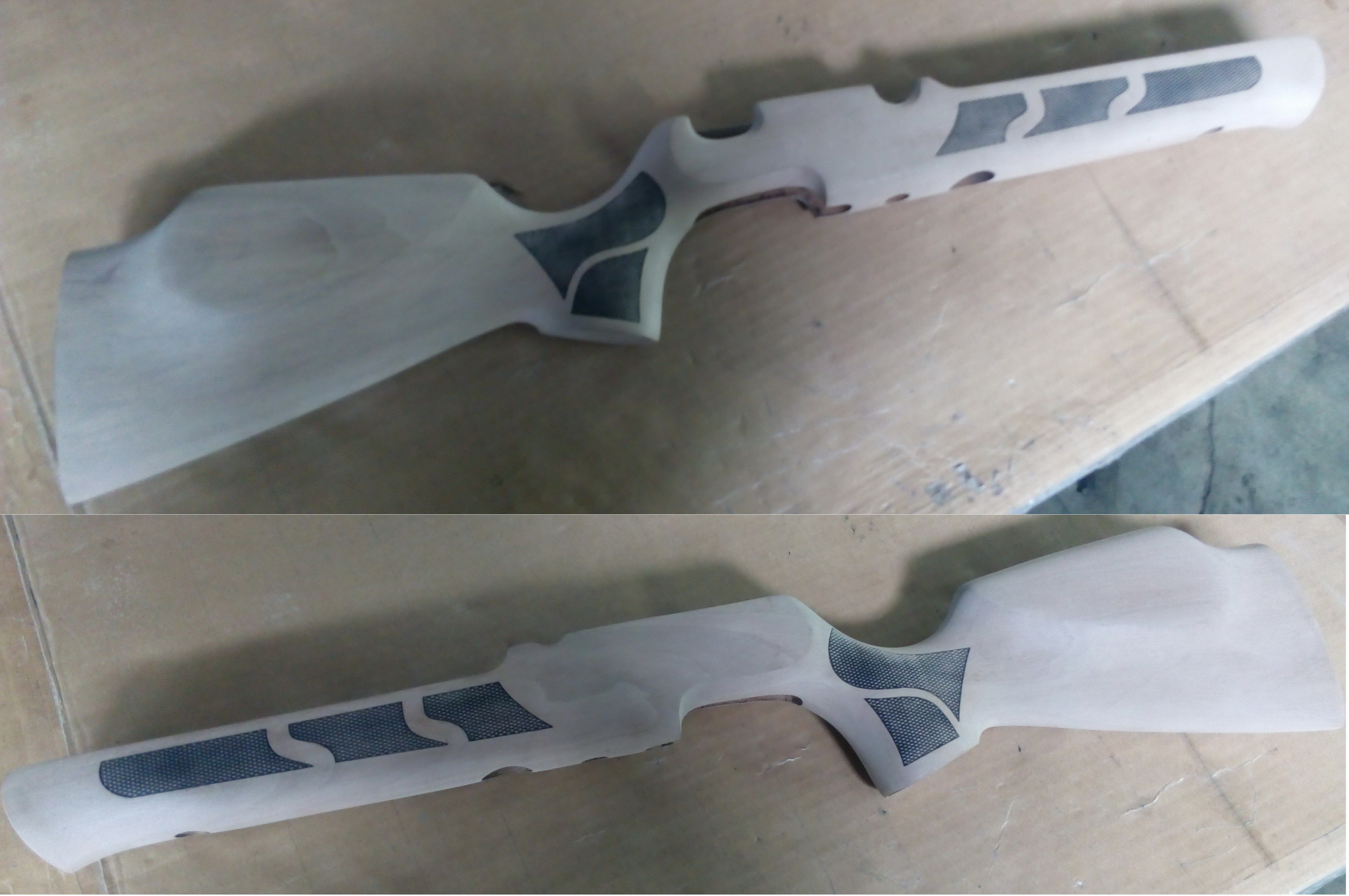 После закрепил её надёжно на рукояти винтовки. Между пяткой и рукоятью сделал прокладку из белого ПВХ пластика от электрокороба. Легко обрабатывается, полируется и даже после нанесения пропитки всё равно остаётся белый. После высыхания клея обработал пятку с прокладкой и слил с рукоятью. Итог: