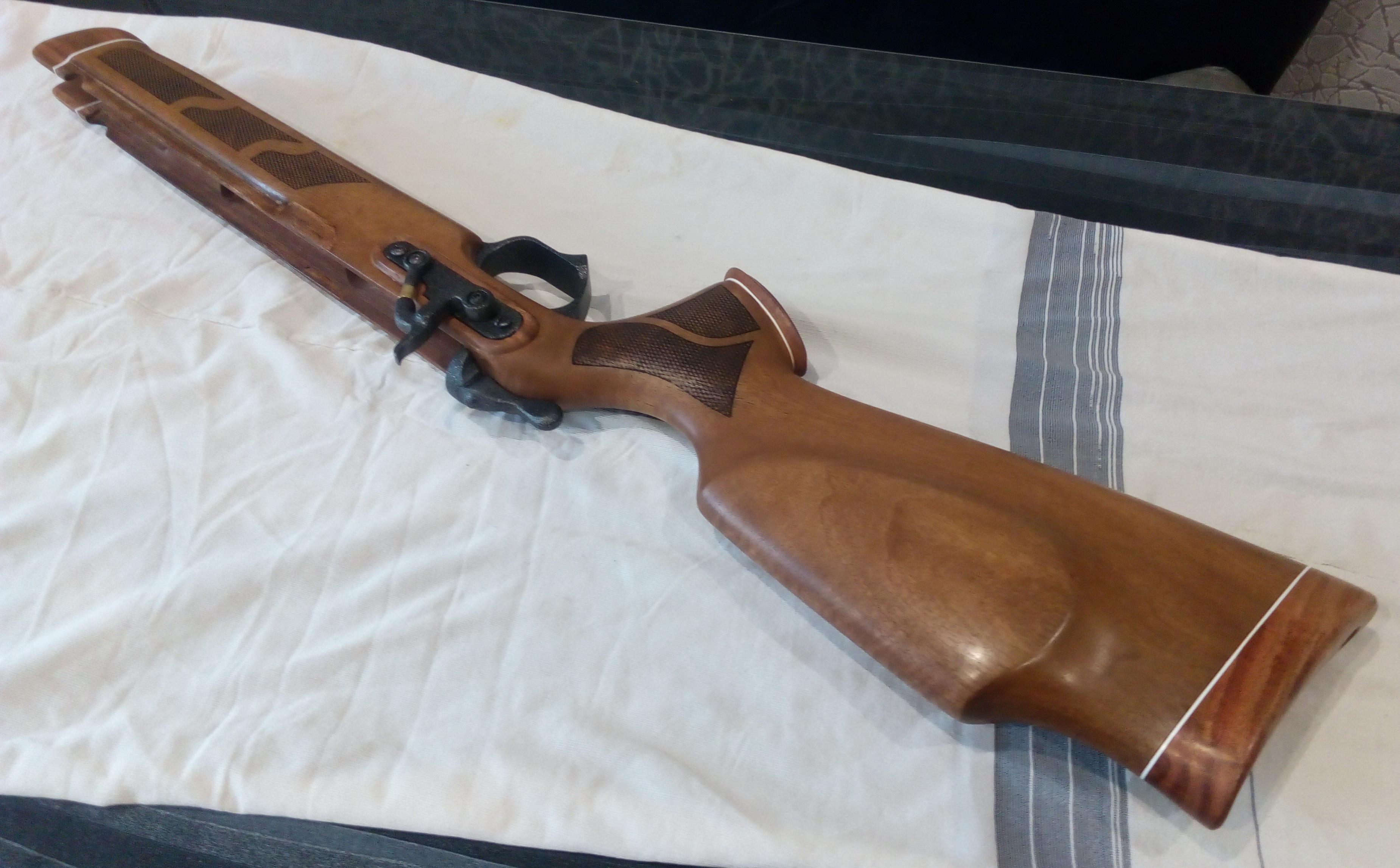 Стала ложа заметно темнее. Но красивая зараза! Я по совести был очень доволен. Ну и разумеется отполировал дерево с усердием шерстяной рукавичкой. Кстати удобно! Одеваешь обе, одной держишь-второй натираешь. И вот таким стало дерево после полировки: